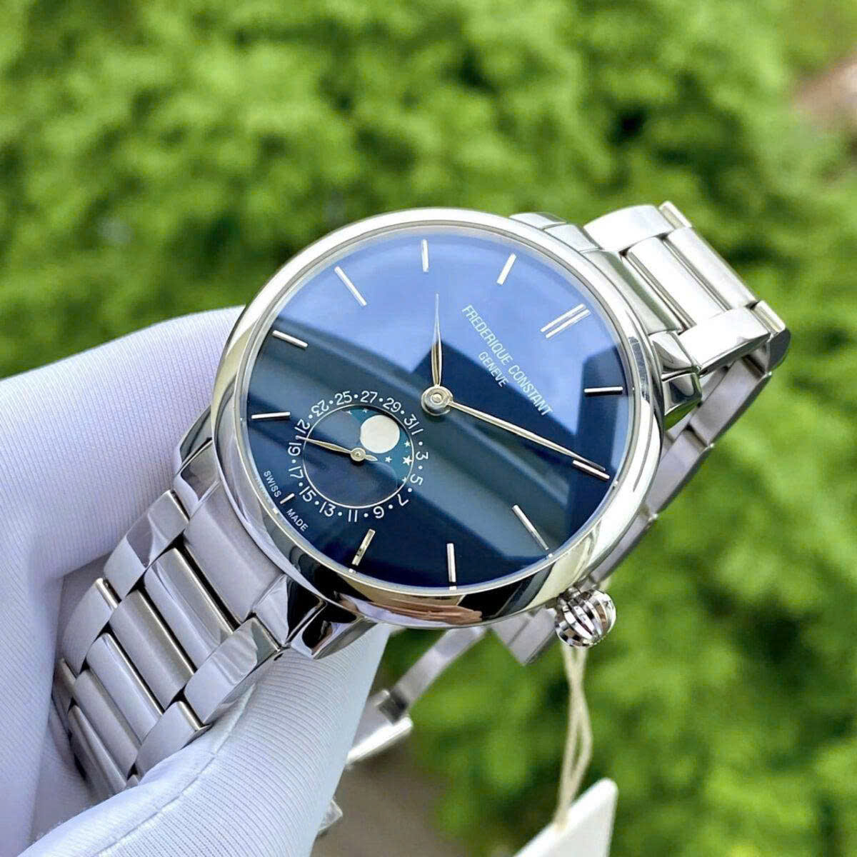 Chiếc đồng hồ Frederique Constant này sở hữu thiết kế thanh lịch với dây thép không gỉ toát nên vẻ bền bỉ và sang trọng. Mặt số xanh kết hợp cùng bộ kim thanh thoát bạc nổi bật trên nền cọc số tối giản đầy tinh tế. Điểm nhấn ấn tượng nằm ở mặt số phụ Moon phase tại vị trí 6h vừa hiển thị lịch ngày mang lại chiều sâu thẩm mỹ. Sự cân đối hoàn hảo giúp chiếc đồng hồ vượt xa chức năng xem giờ mà còn trở thành phụ kiện đẳng cấp phản chiếu gu thẩm mỹ tinh tế và phong thái tự tin của quý ông