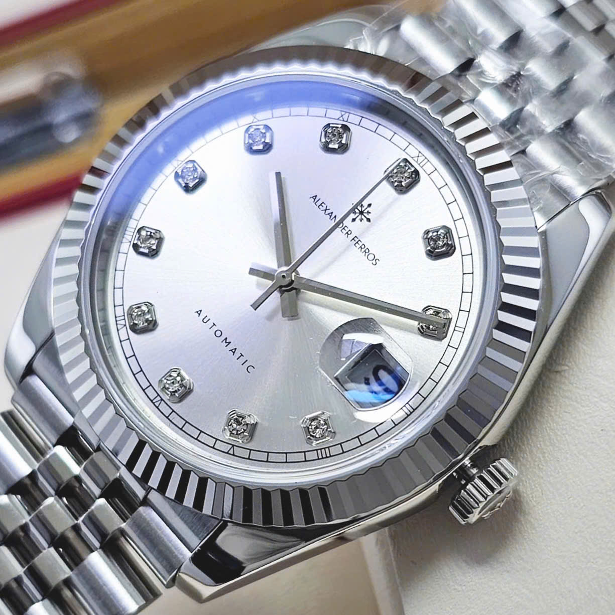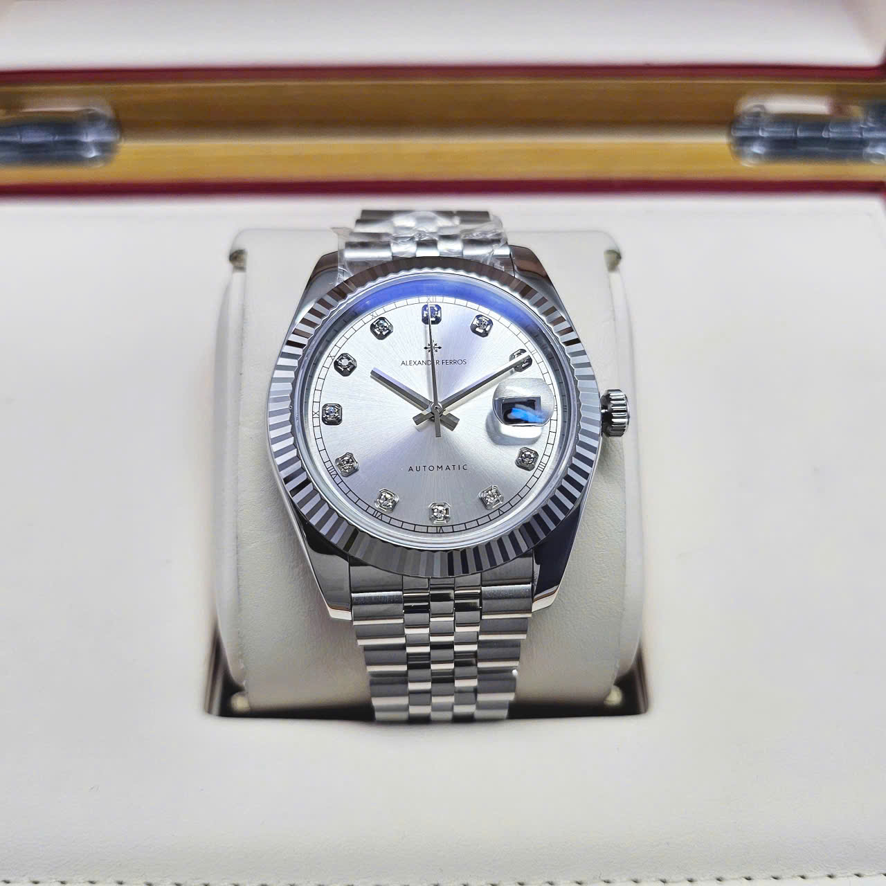 Alexander Ferros Automatic 8132S/02 là mẫu đồng hồ dành cho những quý ông yêu thích sự tinh tế, gọn gàng nhưng vẫn muốn có điểm nhấn riêng trên cổ tay. Sự kết hợp giữa thiết kế full trắng bạc thanh lịch, chi tiết đính đá và bộ máy cơ bền bỉ giúp mẫu này trở thành lựa chọn đáng cân nhắc trong phân khúc. Nếu bạn đang tìm một chiếc đồng hồ vừa dễ đeo, vừa nâng tầm phong cách – đây là lựa chọn rất hợp lý.
