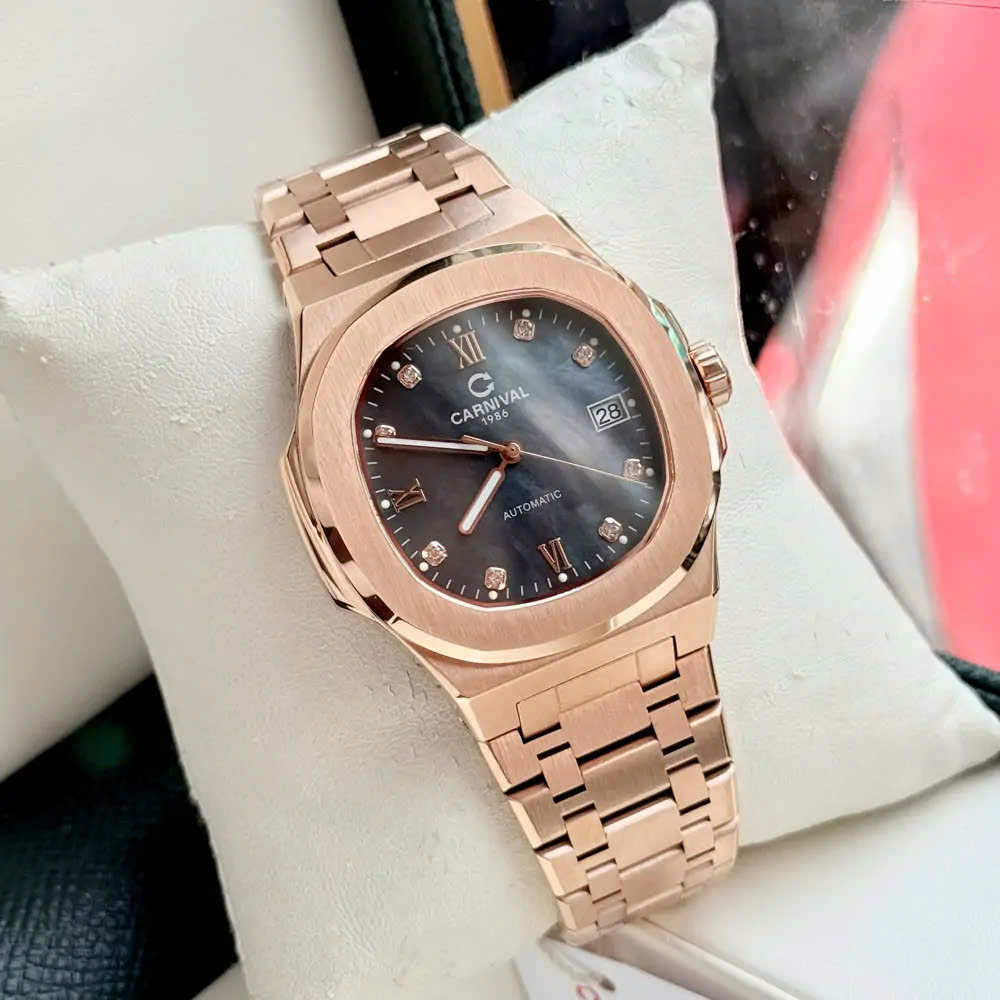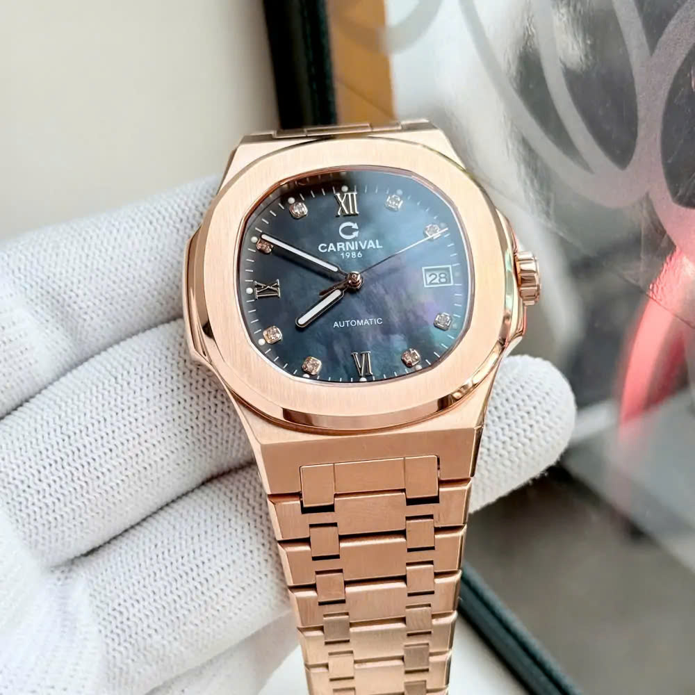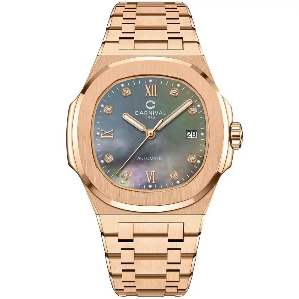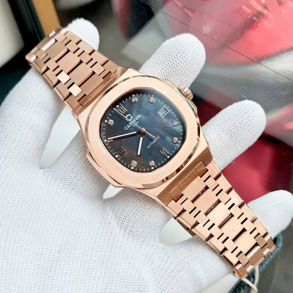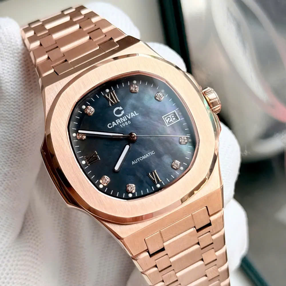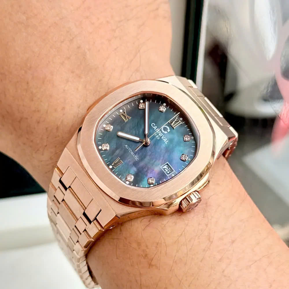 Thiết kế mang phong cách cao cấp – nam tính và thời thượng với mặt đồng hồ khảm trai lạ mắt cuốn hút với cọc số kết hợp giữa số La Mã và đá đính nổi, tạo điểm nhấn sang trọng và cuốn hút, dáng mặt cushion (bo góc vuông nhẹ) hiện đại, phối cùng dây thép không gỉ mạ vàng hồng sang trọng – biểu tượng của sự đẳng cấp và bền bỉ xứng tầm cho các chàng săn đón.