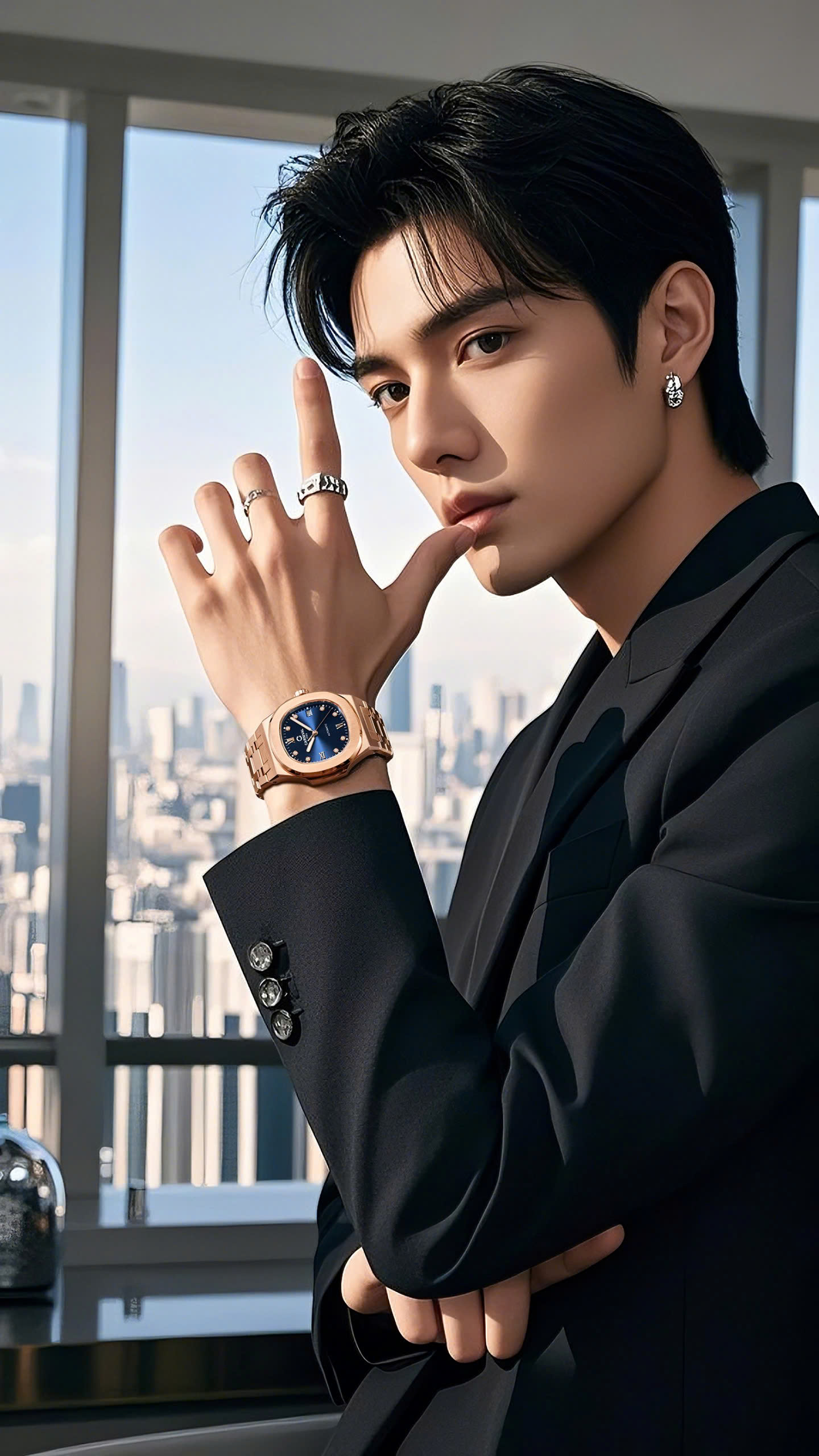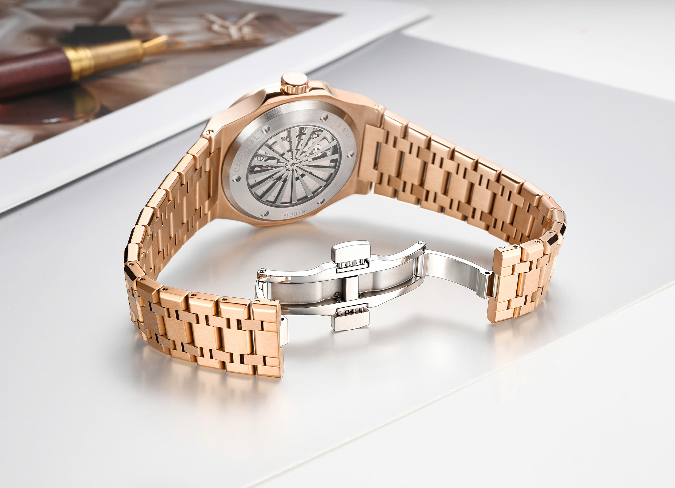 Thiết kế mang phong cách cao cấp – nam tính và thời thượng với mặt đồng hồ xanh dương mạnh mẽ với cọc số kết hợp giữa số La Mã và đá đính nổi, tạo điểm nhấn sang trọng và cuốn hút, dáng mặt cushion (bo góc vuông nhẹ) hiện đại, phối cùng dây thép không gỉ mạ vàng hồng sang trọng – biểu tượng của sự đẳng cấp và bền bỉ xứng tầm cho các chàng săn đón.