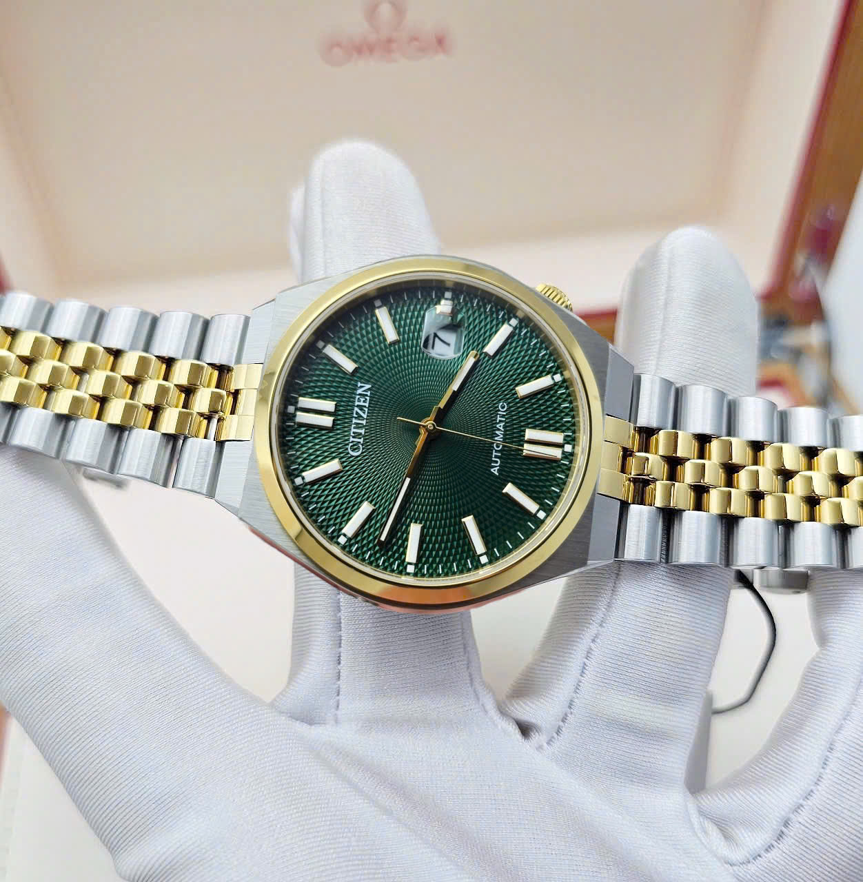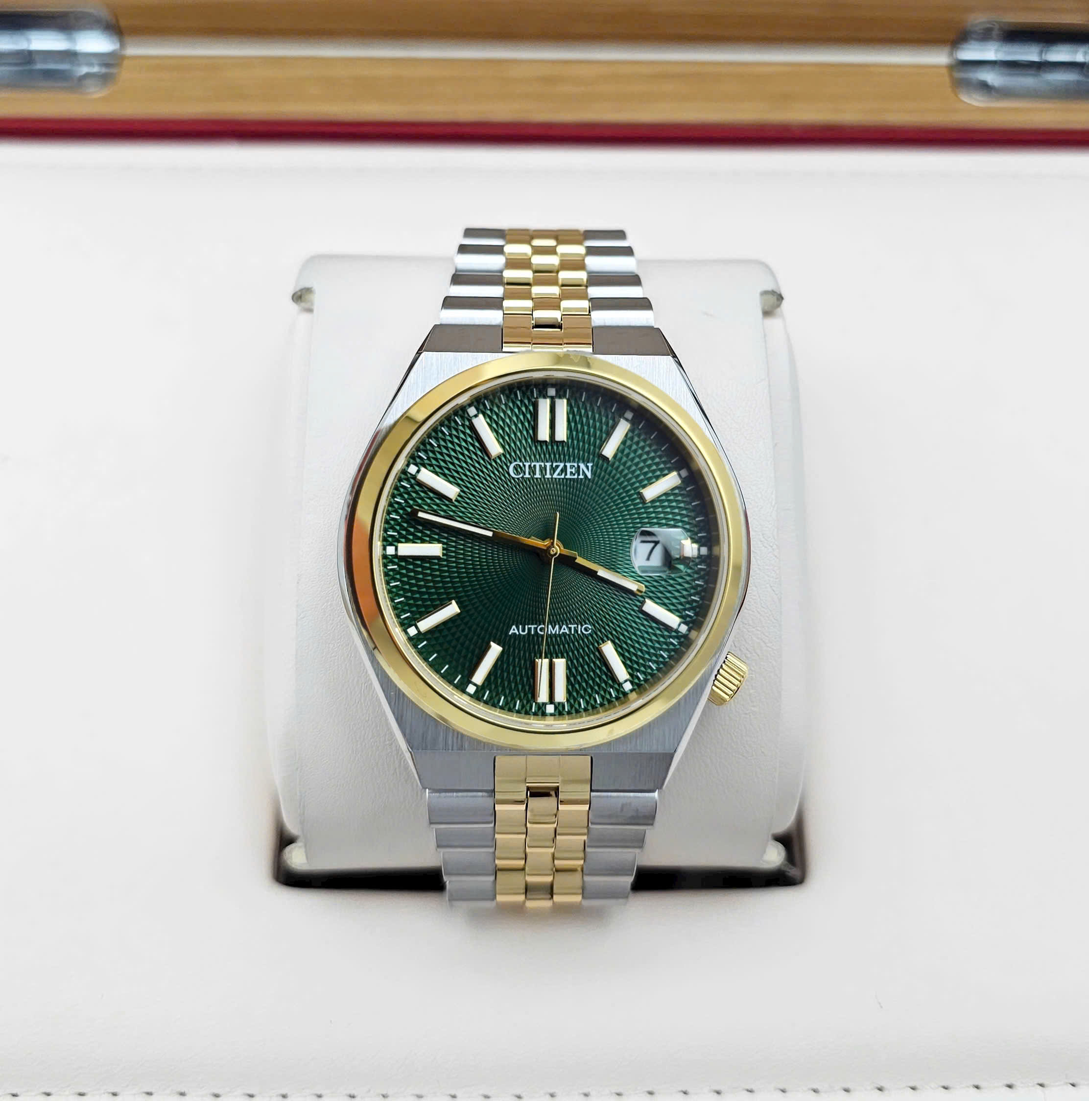 Chiếc Citizen Automatic này sở hữu thiết kế demi vàng – bạc đầy cuốn hút mang lại sự cân bằng giữa sang trọng và trẻ trung. Mặt số xanh lá với họa tiết Guilloché tinh xảo, nổi bật cùng kim và cọc số phủ vàng và dạ quang phát cực sáng trong bóng tối. Ô lịch ngày tại vị trí 3 giờ được trang bị kính lúp phóng đại tiện lợi cho việc quan sát hàng ngày. Dây thép không gỉ cao cấp chắc chắn vừa tôn lên vẻ lịch lãm của người đeo. Bộ máy cơ Nhật Bản bền bỉ chính xác và khẳng định đẳng cấp và giá trị sử dụng lâu dài. Đây là phụ kiện hoàn hảo dành cho quý ông yêu thích sự khác biệt và tinh tế.
