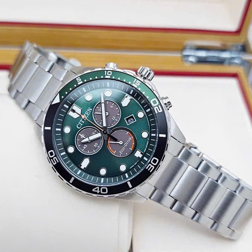Thiết kế có mặt số tròn to với viền thép không gỉ bao quanh nền số màu xanh lá bắt mắt, kim chỉ và cọc số thanh mảnh tông bạc thanh lịch được phủ dạ quang nổi bật, đặc biệt khả năng chống nước lên tới 100m rất phù hợp cho người đeo yêu thích bơi lội tạo nên phiên bản đậm phong cách thể thao sang trọng dành cho phái mạnh.