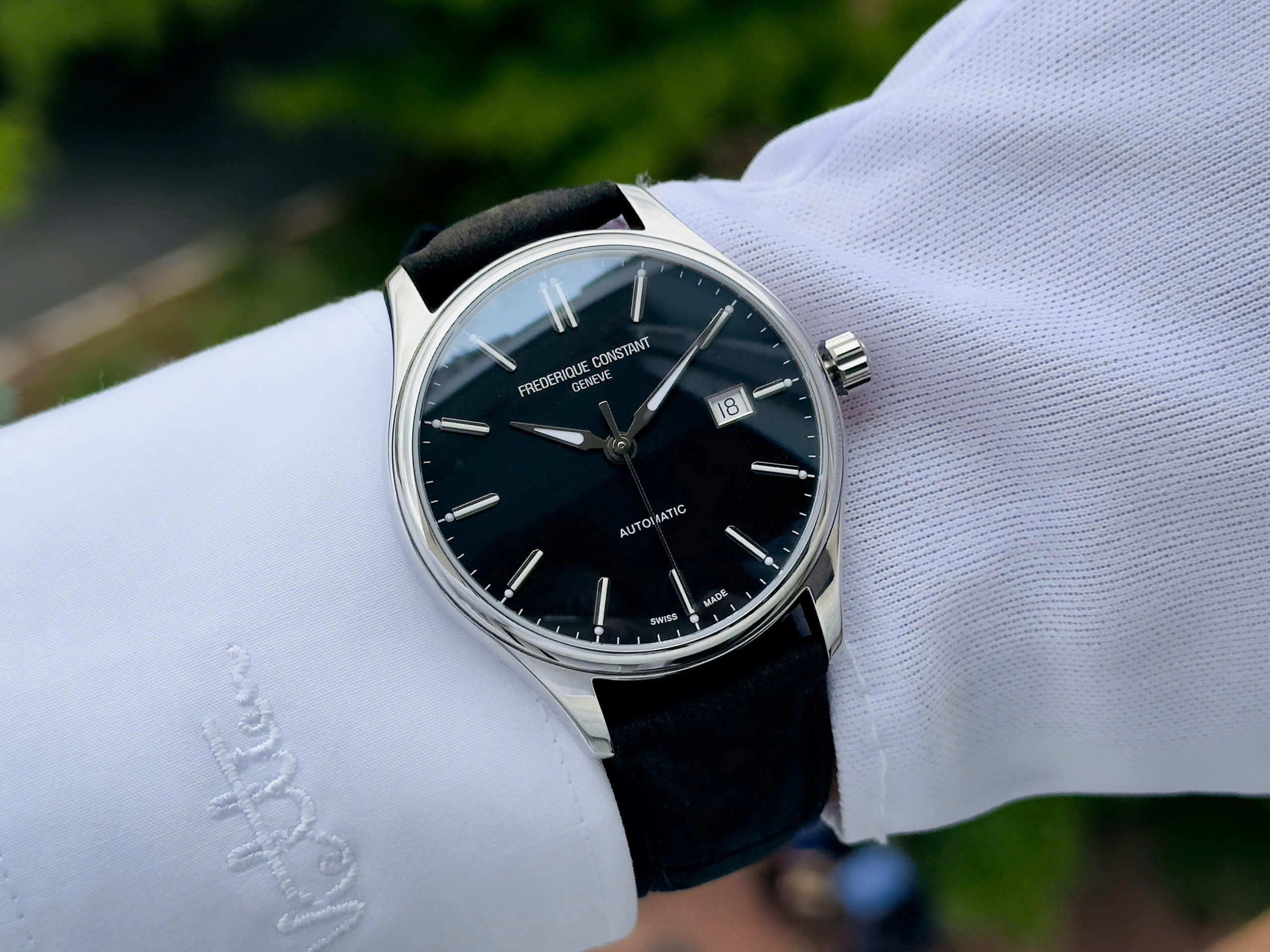 Chiếc Frederique Constant toát lên phong thái chuẩn mực của sự tối giản và sang trọng. Mặt số đen sang trọng được bố trí gọn gàng với cọc số thanh mảnh cùng kim chỉ giờ phủ dạ quang phát cực sáng trong bóng tối tạo nên vẻ cân đối và hiện đại. Điểm nhấn nằm ở ô lịch ngày tại vị trí 3h vừa tiện dụng vừa giữ trọn nét tinh tế. Vỏ thép không gỉ kết hợp dây da đen thanh lịch mang lại sự hài hòa trong tổng thể. Đây là chiếc đồng hồ lý tưởng cho những quý ông yêu thích phong cách cổ điển nhưng vẫn hiện đại.