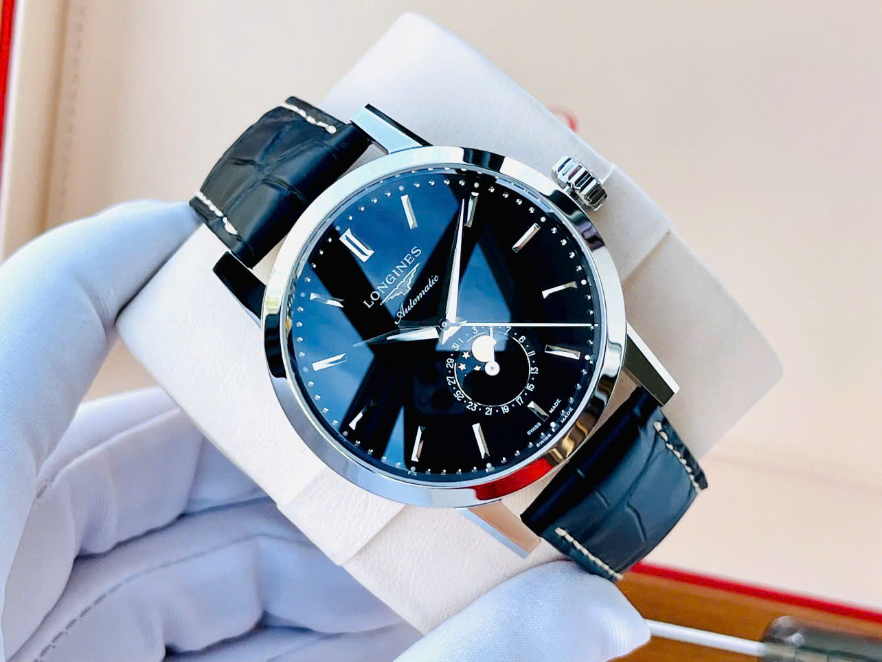 Khi đeo Longines 1832 Moon Phase, cảm giác đầu tiên là rất cân đối và “đằm”. Đồng hồ ôm tay, không quá mỏng cũng không dày cộm. Mặt số đen kết hợp Moon Phase tạo chiều sâu, càng nhìn lâu càng thấy đẹp – đúng kiểu đồng hồ để thưởng thức, không phải để khoe.