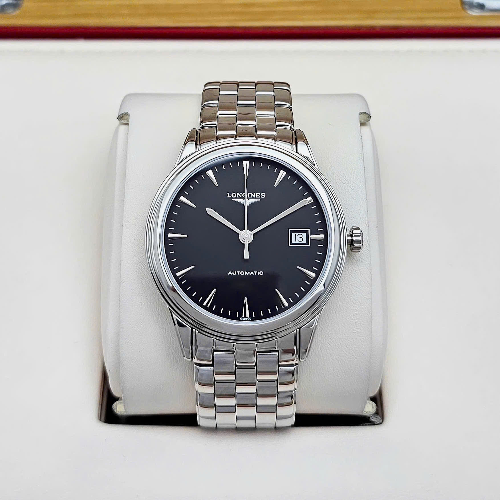 Thiết kế dây & vỏ thép không gỉ sáng bóng, kim chỉ thanh mảnh nổi bật trên nền đen huyền bí, sang trọng dành cho các quý ông.
