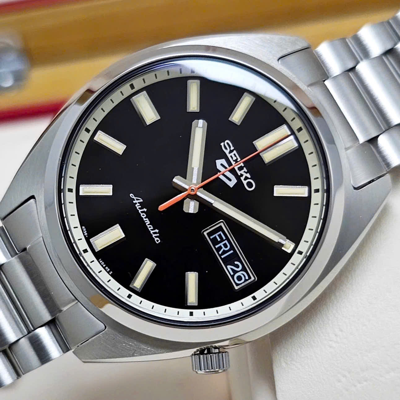 Chiếc Seiko 5 Automatic mặt đen mang phong cách tối giản nhưng mạnh mẽ được thiết kế dành cho những ai yêu thích sự tinh tế mặt số đen sang trọng kết hợp cùng cọc số và kim phủ dạ quang mang lại khả năng hiển thị rõ nét cả trong điều kiện thiếu sáng. Bộ máy cơ tự động chuẩn Nhật Bản vận hành ổn định đi kèm lịch ngày – thứ tiện lợi ở vị trí 3 giờ. Dây thép không gỉ cùng vỏ đồng hồ được hoàn thiện tỉ mỉ vừa chắc chắn vừa toát lên vẻ lịch lãm. Đây là một lựa chọn đẳng cấp giá trị lâu dài mà còn khẳng định phong cách cho phái mạnh trong mọi hoàn cảnh.