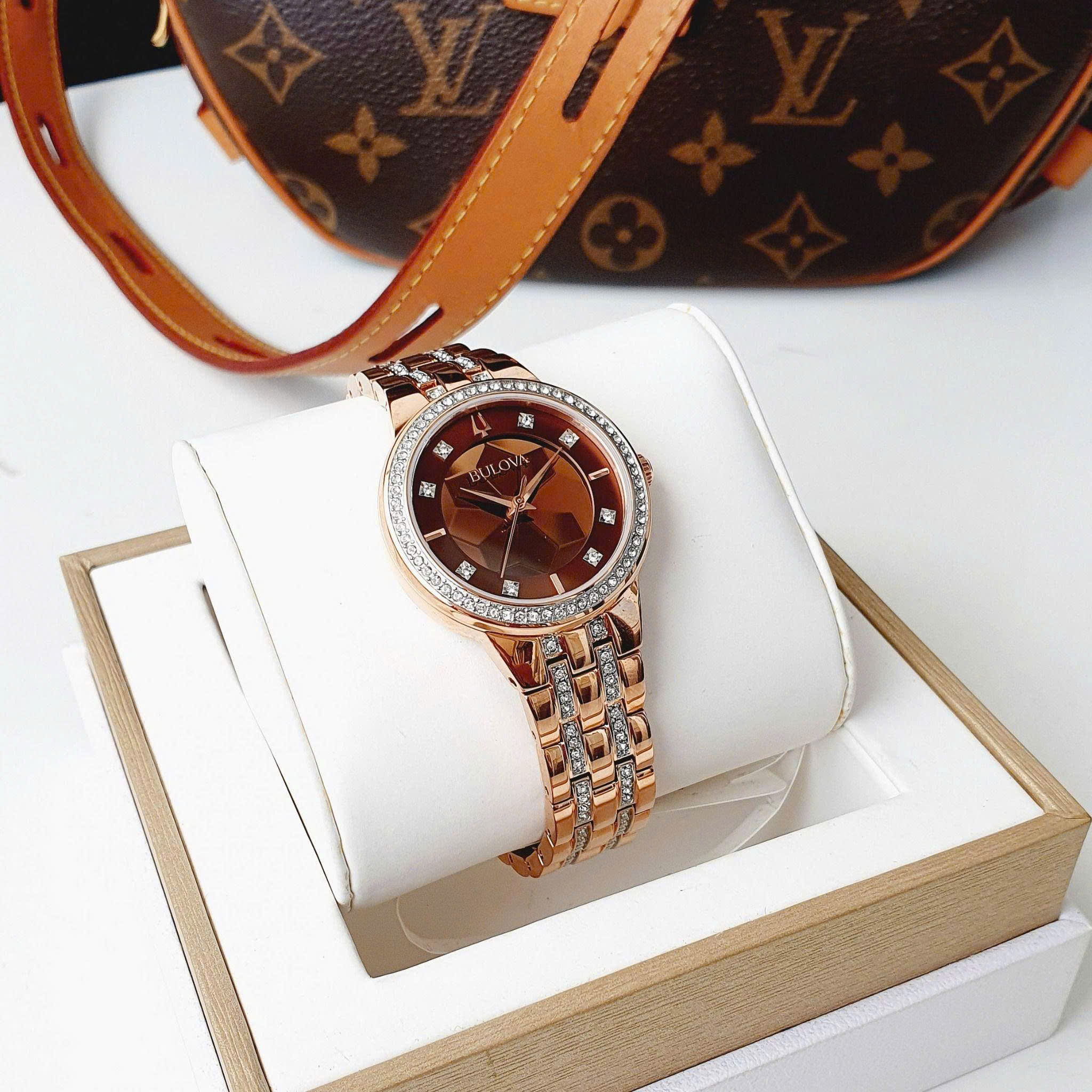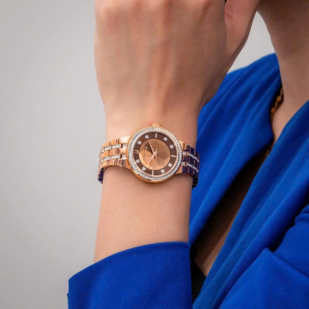 Thiết kế sang trọng, thanh lịch và phảng phất hơi thở cổ điển cùng những nét hiện đại được điểm xuyết dọc, mặt số hơi ngả nâu chocolate nổi bật khắc hoa tráng gương lung linh, tinh xảo, kết hợp đính 8 viên kim cương phù hợp cho mọi khoảng khắc quan trọng luôn được các quý cô ưu tiên lựa chọn.