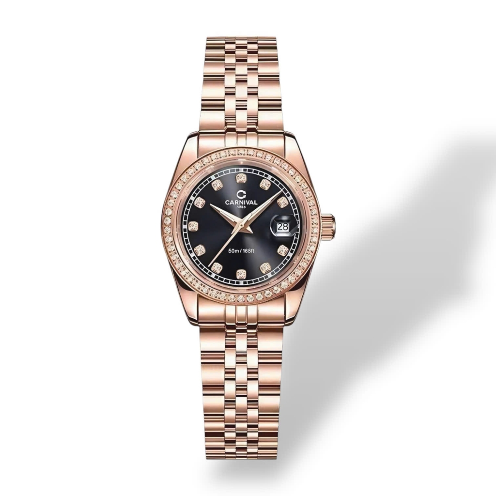 Chiếc đồng hồ Carnival mạ vàng hồng sang trọng này mang thiết kế tinh tế nổi bật với mặt số đen huyền bí kết hợp cùng các cọc số đính đá sáng lấp lánh tạo nên vẻ đẹp kiêu sa và đẳng cấp. Vành bezel được viền đá tỉ mỉ tăng thêm sự quý phái cho tổng thể. Dây kim loại cao cấp ôm sát cổ tay và tôn lên nét thanh lịch. Đồng hồ còn trang bị lịch ngày tiện lợi và khả năng chống nước 50m phù hợp cho cả môi trường công việc lẫn các sự kiện sang trọng. Đây là phụ kiện thời trang cao cấp và khẳng định giá trị và đẳng cấp của người sở hữu.