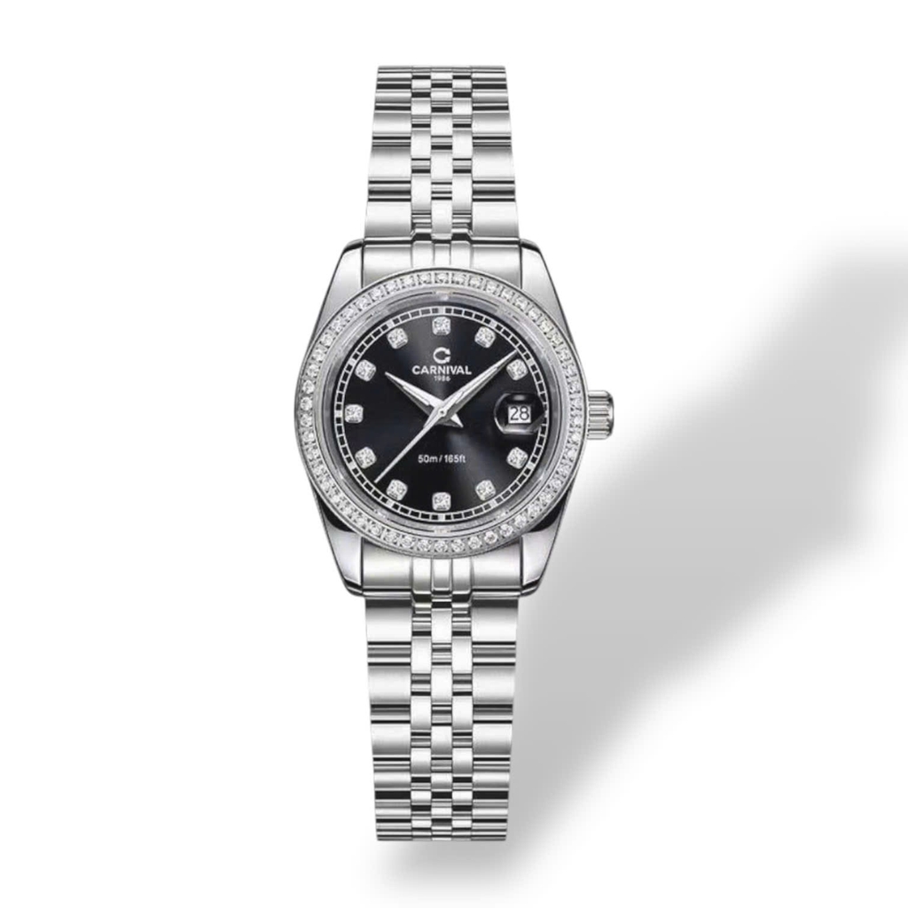 Chiếc đồng hồ Carnival này là sự kết hợp hoàn hảo giữa vẻ đẹp sang trọng và chức năng tiện ích. Mặt số màu đen huyền bí nổi bật với các viên đá quý lấp lánh làm tăng thêm vẻ quý phái cho người sở hữu. Với thiết kế vỏ và dây đeo thép không gỉ cao cấp chiếc đồng hồ này không chỉ có tính thẩm mỹ cao mà còn bền bỉ với thời gian. Đây không đơn thuần là chiếc đồng hồ xem giờ mà là phụ kiện đẳng cấp khẳng định gu thẩm mỹ và thời trang của quý cô.