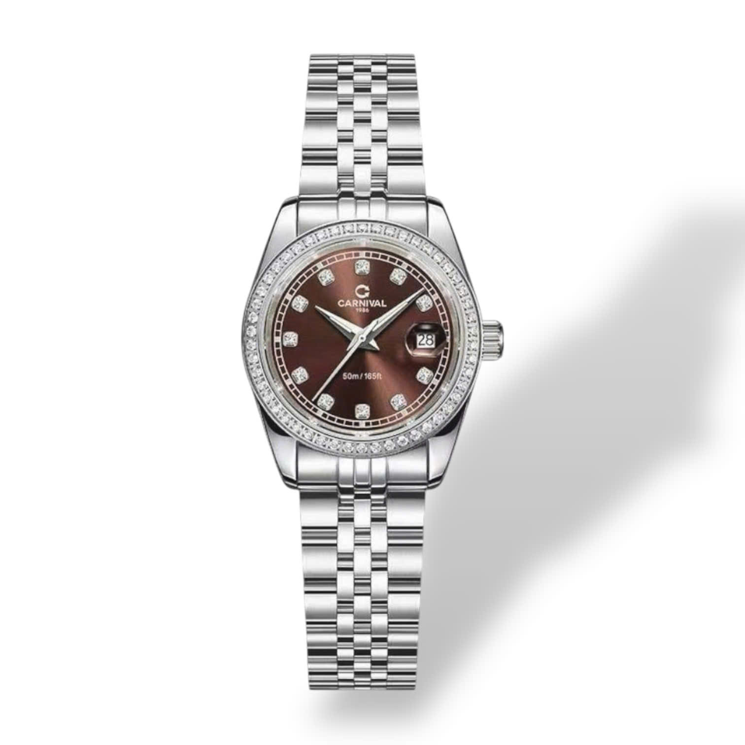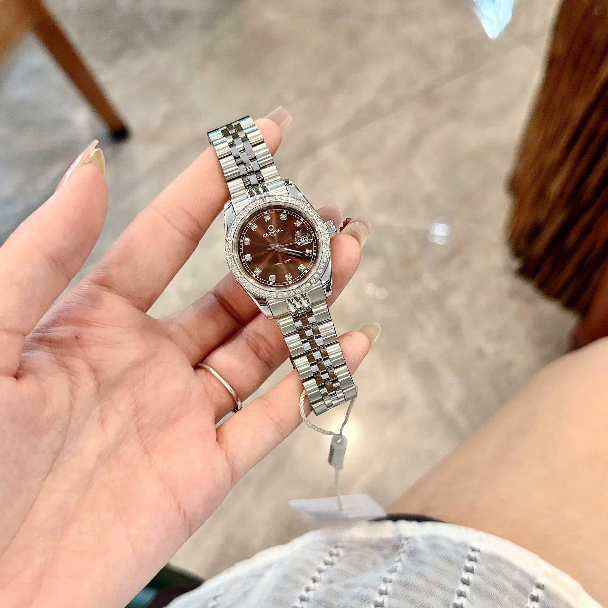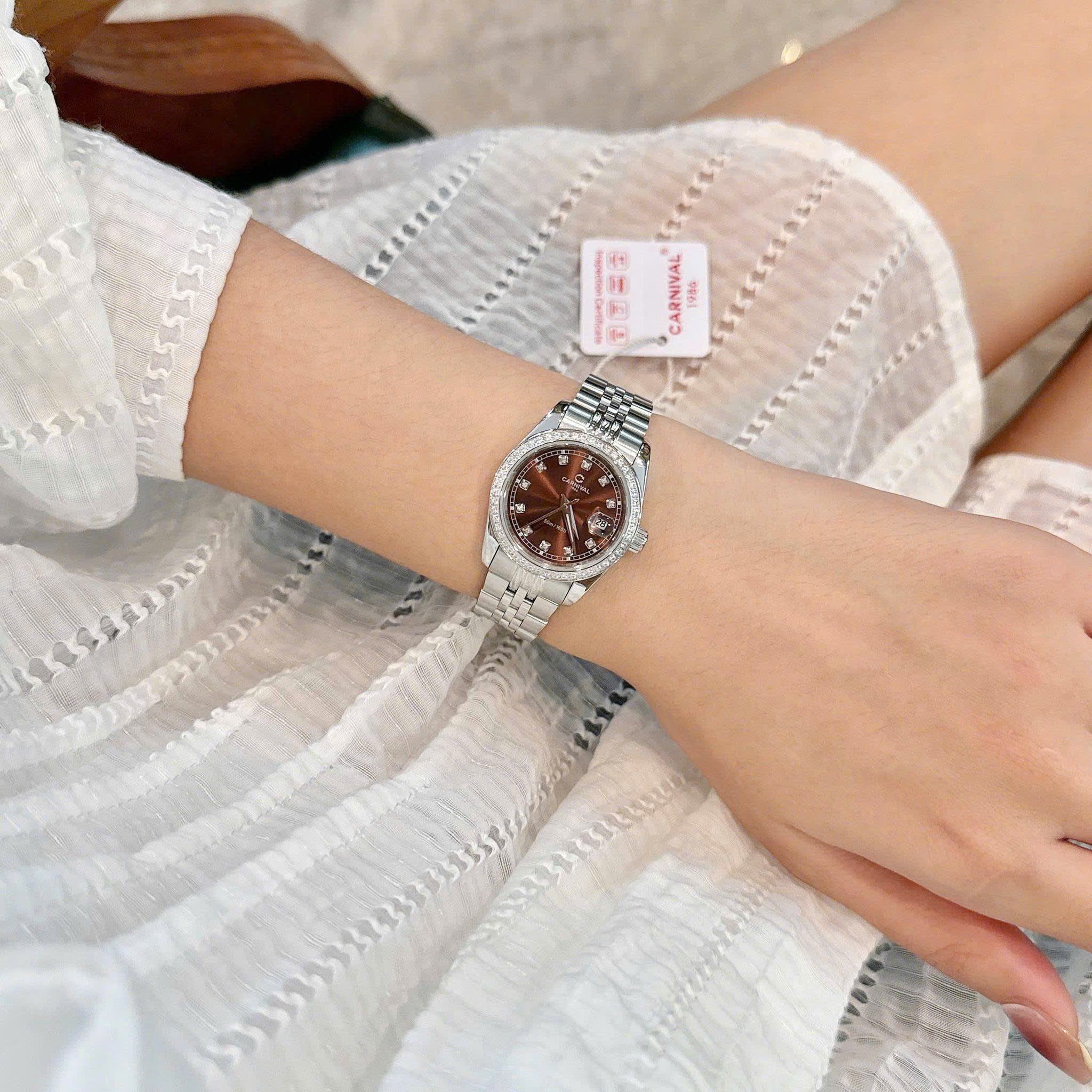 Đồng hồ Carnival dây thép không gỉ cao cấp mang đến vẻ đẹp sang trọng và tinh tế cho người đeo. Mặt số nâu độc đáo kết hợp cùng cọc số đính đá sáng lấp lánh với viền bezel full đá tinh xảo tạo nên sức hút đẳng cấp. Dây kim loại được thiết kế tỉ mỉ vừa vặn và bền bỉ phù hợp với nhiều phong cách. Tích hợp lịch ngày tiện lợi chiếc đồng hồ đáp ứng cả tính năng lẫn thời trang. Đây không chỉ là công cụ xem giờ mà còn là phụ kiện khẳng định giá trị và phong thái khác biệt cho người sở hữu.