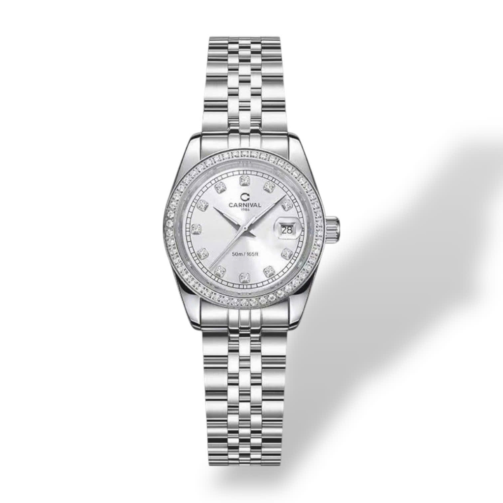 Chiếc đồng hồ Carnival này là biểu tượng của sự tinh tế và đẳng cấp với thiết kế sang trọng tông bạc đầy cuốn hút. Mặt số trắng đính đá sáng lấp lánh kết hợp cùng viền bezel đính full đá tạo nên vẻ đẹp rực rỡ và quý phái. Bộ dây thép không gỉ cao cấp mang lại cảm giác bền bỉ và hiện đại. Đồng hồ được trang bị lịch ngày tiện lợi tại vị trí 3 giờ và khả năng chống nước 50m phù hợp cho cả công việc lẫn dạo phố. Đây chính là lựa chọn hoàn hảo cho những ai yêu thích sự sang trọng và muốn khẳng định phong cách đẳng cấp của mình.
