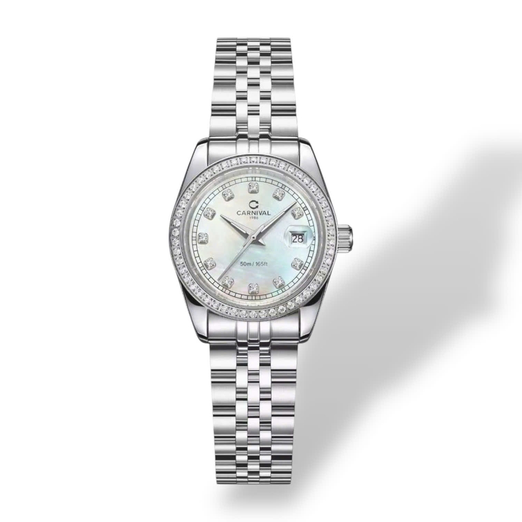 Đồng hồ Carnival dây thép không gỉ mang đến phong cách sang trọng và đẳng cấp với thiết kế tinh xảo. Mặt số trắng khảm trai tự nhiên tỏa sáng nhẹ nhàng kết hợp cùng cọc số đính đá lấp lánh tạo nên vẻ đẹp thanh lịch và quý phái. Viền bezel full đá cao cấp làm nổi bật sự sang trọng trong từng chi tiết. Dây kim loại được chế tác tỉ mỉ ôm gọn cổ tay và bền bỉ theo thời gian. Trang bị lịch ngày tiện ích và khả năng chống nước 50m chiếc đồng hồ này không chỉ là công cụ xem giờ mà còn là phụ kiện thời trang cao cấp khẳng định giá trị của người sở hữu.