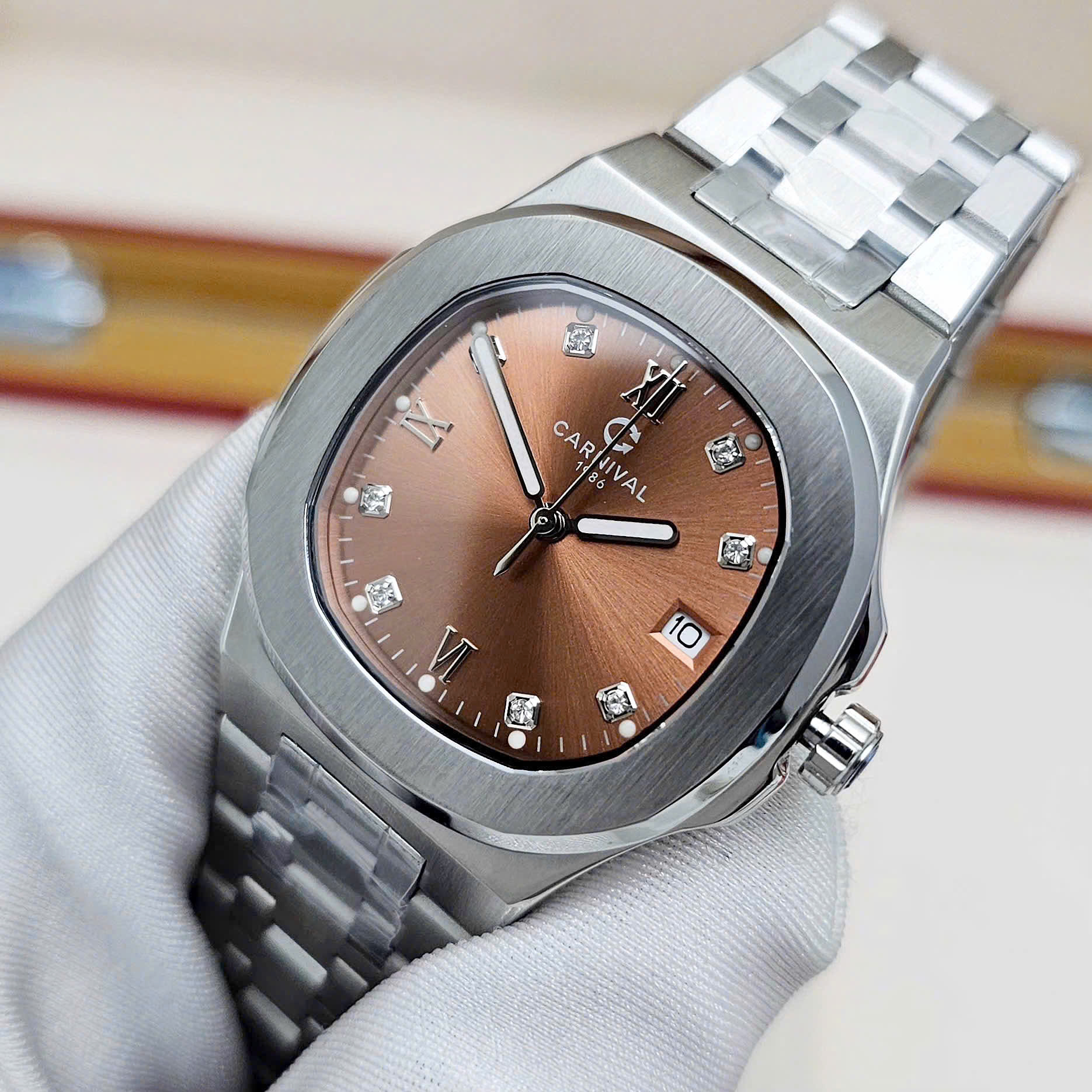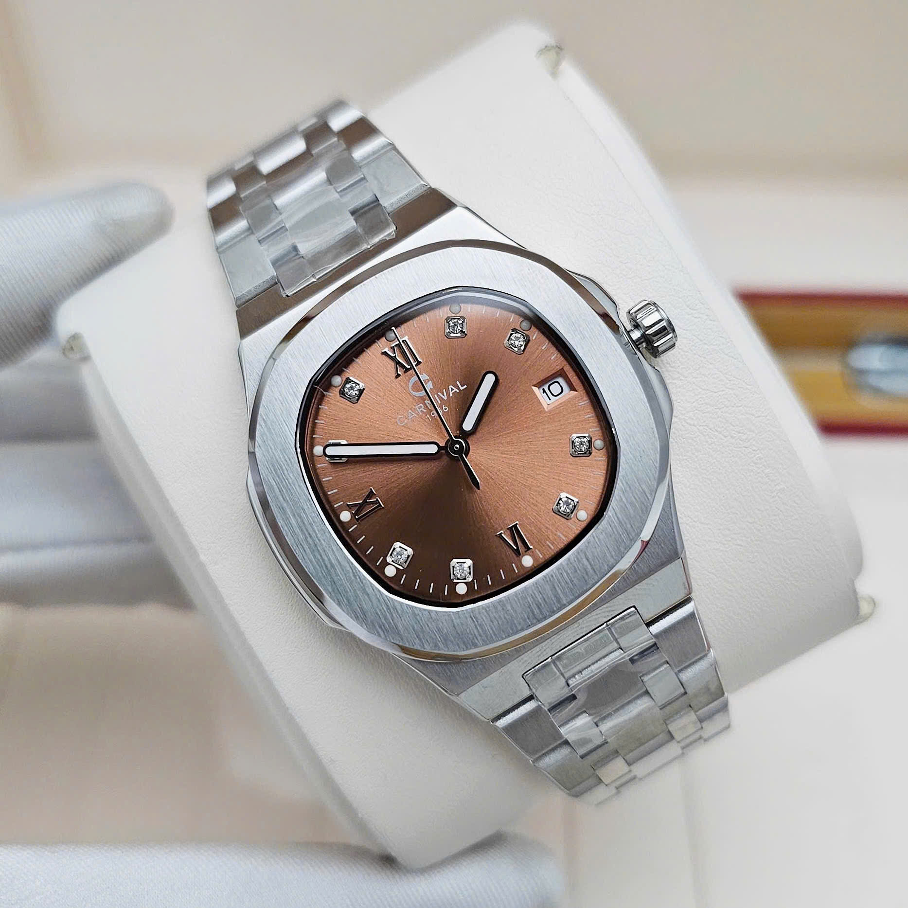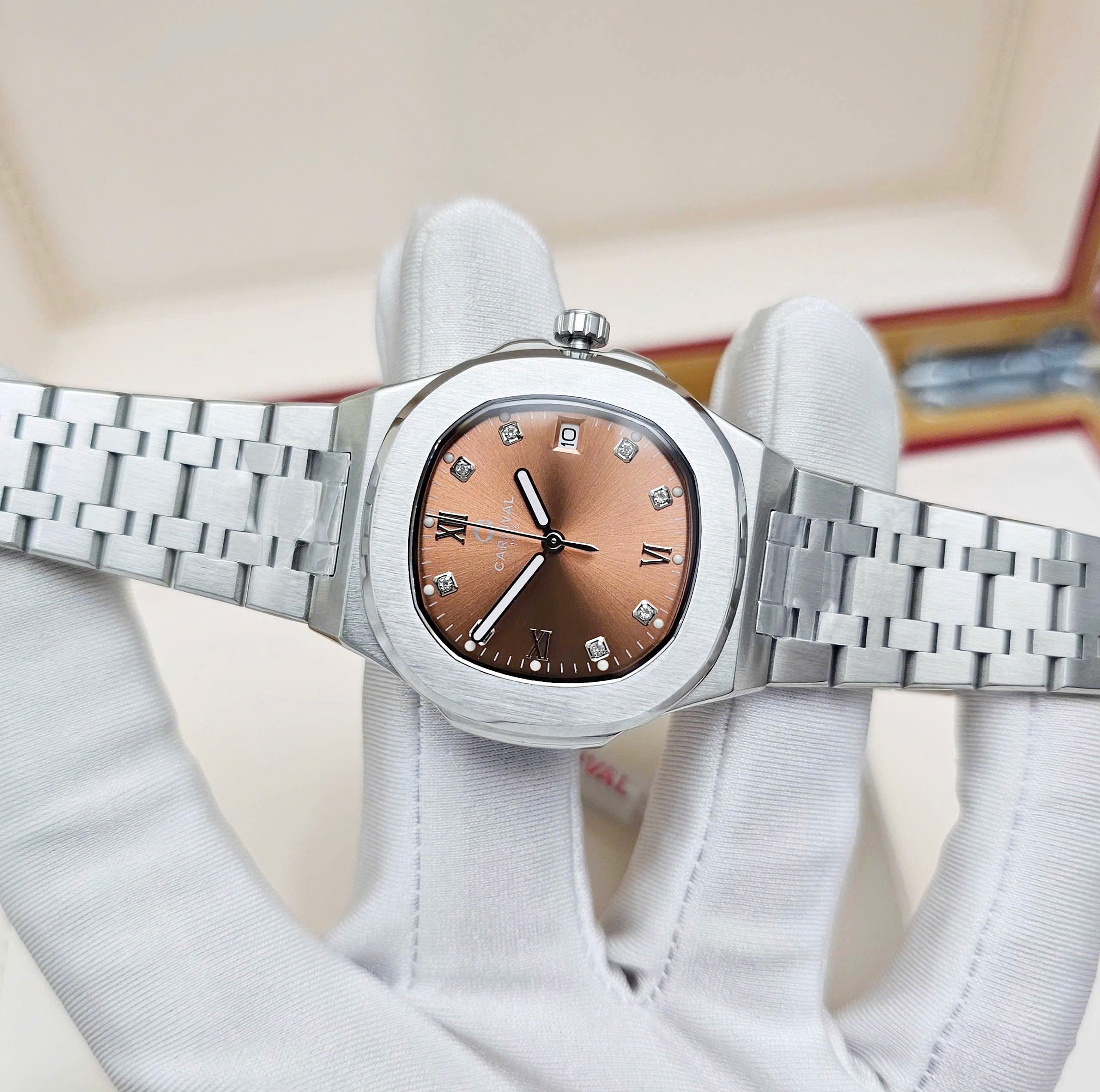 Thiết kế dây & vỏ thép không gỉ cùng mặt số nâu nổi bật là cọc số La mã cổ điển cùng những viên đá lấp lánh, quyến rũ dành cho phái đẹp.