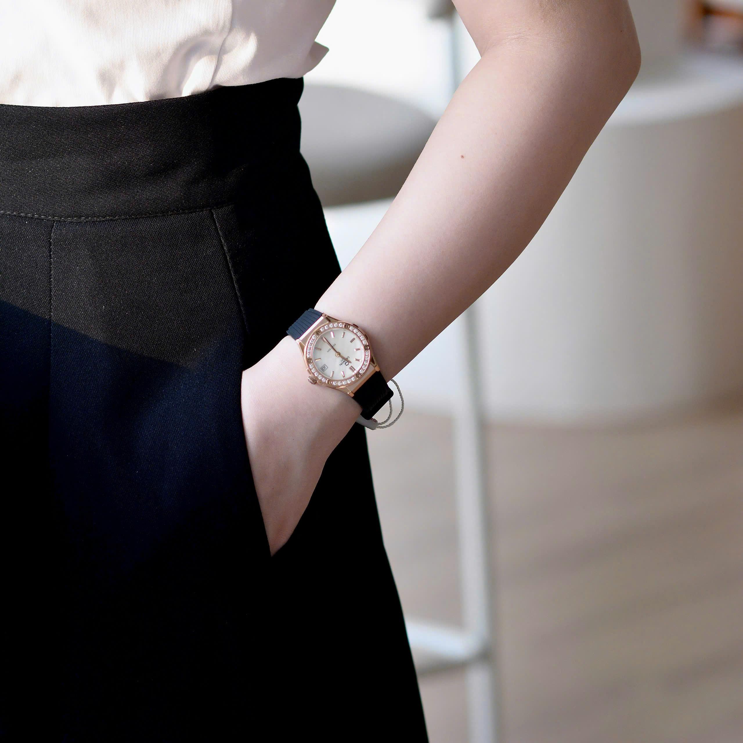 Thiết kế nổi bật với viền vàng hồng tinh xảo đính đá sáng lấp lánh quanh mặt số trắng tạo nên vẻ cuốn hút và đẳng cấp. Bộ kim và cọc số mạ vàng nổi bật trên nền trắng mang lại cảm giác tinh tế và thanh lịch. Dây cao su đen cao cấp không chỉ bền bỉ mà còn mang đến sự thoải mái, trẻ trung cho người đeo. Khả năng chống nước 50m giúp đồng hồ phù hợp cho cả công việc, dạo phố lẫn các sự kiện sang trọng khẳng định đẳng cấp của người sở hữu