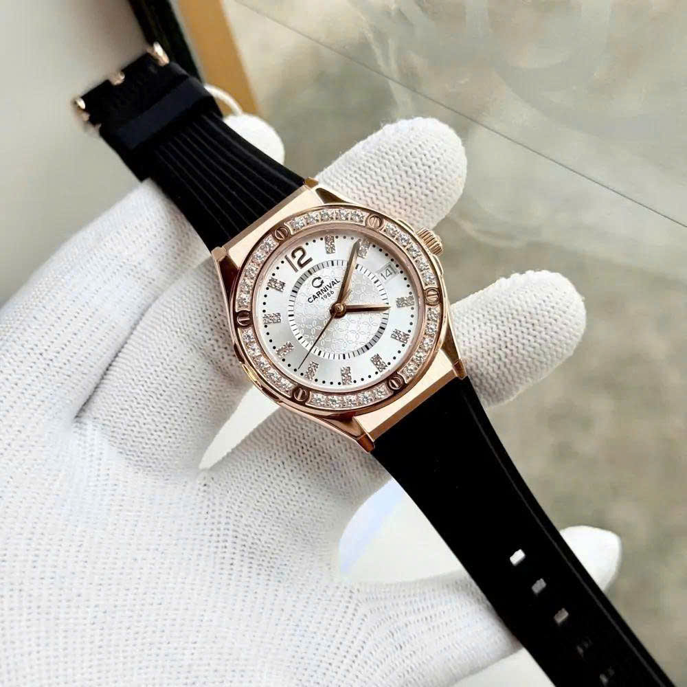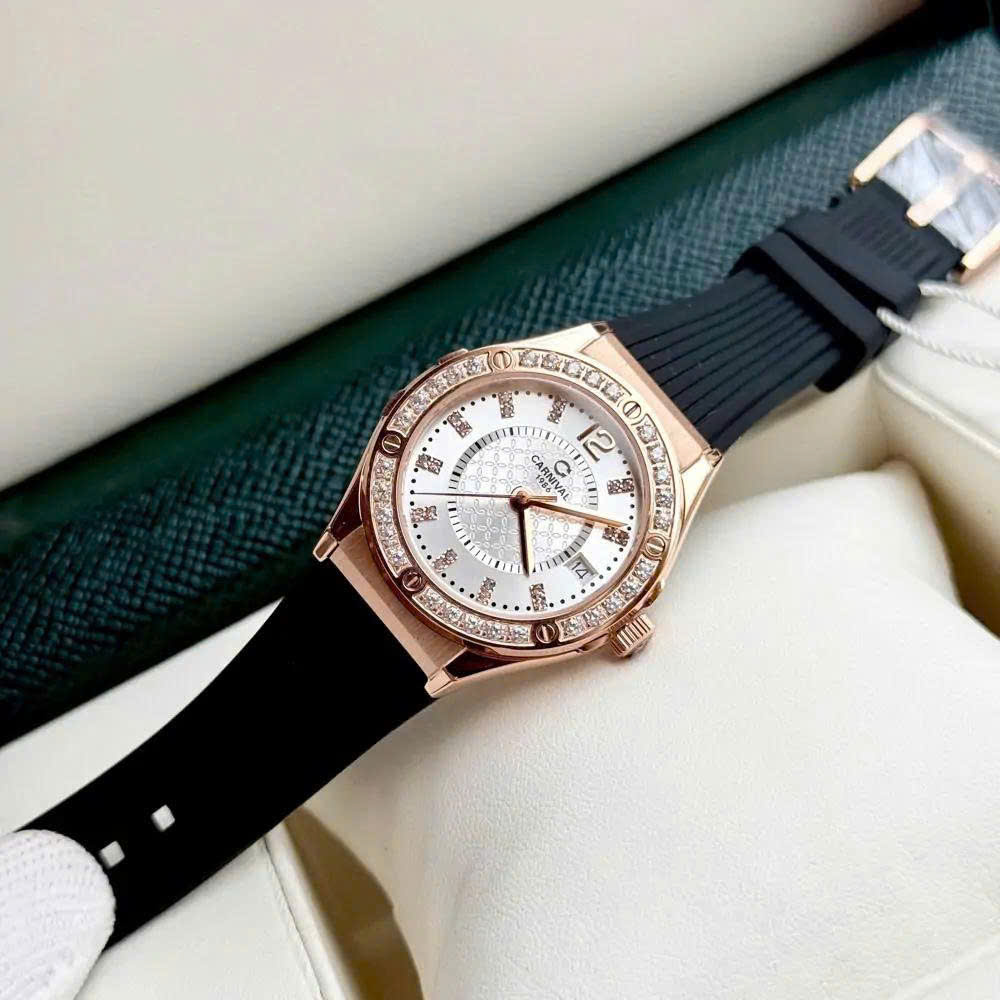 Thiết kế đồng hồ Carnival này sở hữu thiết kế sang trọng và hiện đại với phần vỏ thép không gỉ mạ vàng hồng nổi bật viền bezel được đính đá lấp lánh tạo điểm nhấn cuốn hút. Mặt số trắng tinh khiết kết hợp cùng các cọc số và kim chỉ giờ thanh mảnh vàng mang lại vẻ tinh tế và cuốn hút. Đây không chỉ là một phụ kiện xem giờ mà còn là món trang sức tôn vinh phong cách thời thượng và gu thẩm mỹ tinh tế của quý cô hiện đại.