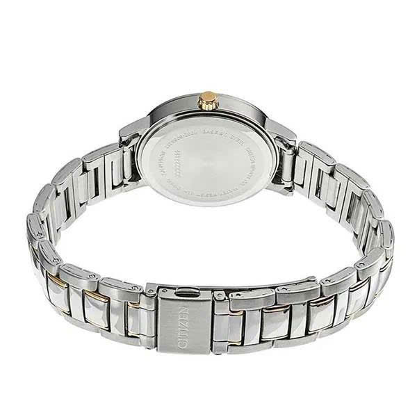 Đồng hồ nữ Citizen hai tông màu sang trọng này là biểu tượng của sự tinh tế và đẳng cấp. Mặt số khảm trai tự nhiên phản chiếu ánh sáng mềm mại viền đính đá lấp lánh tôn lên vẻ quý phái cho cổ tay phái đẹp. Bộ kim chỉ vàng cùng cọc số nổi tạo điểm nhấn thanh lịch trên nền mặt số trang nhã. Dây thép không gỉ phối vàng demi mang lại cảm giác sang trọng và bền bỉ theo thời gian. Đây không chỉ là phụ kiện để xem giờ mà còn là món trang sức xa hoa khẳng định phong cách và đẳng cấp riêng của người phụ nữ hiện đại.