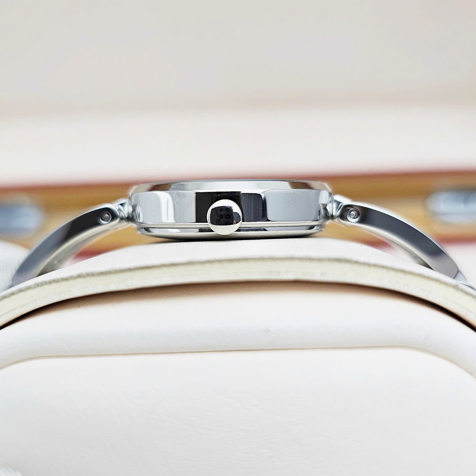 - Vỏ đồng hồ đường kính 28mm, độ dày chỉ 7.2mm – rất gọn, tôn cổ tay nữ.