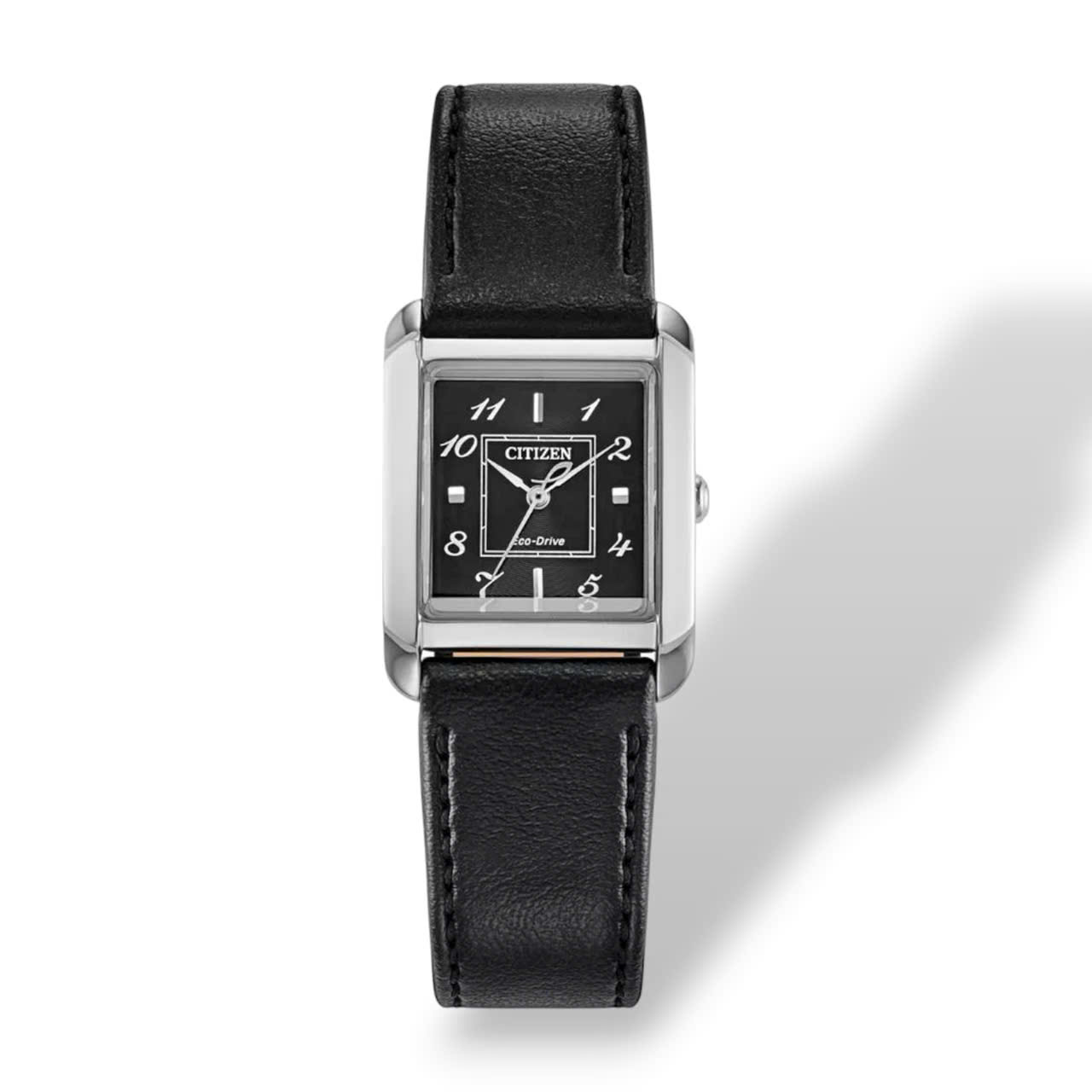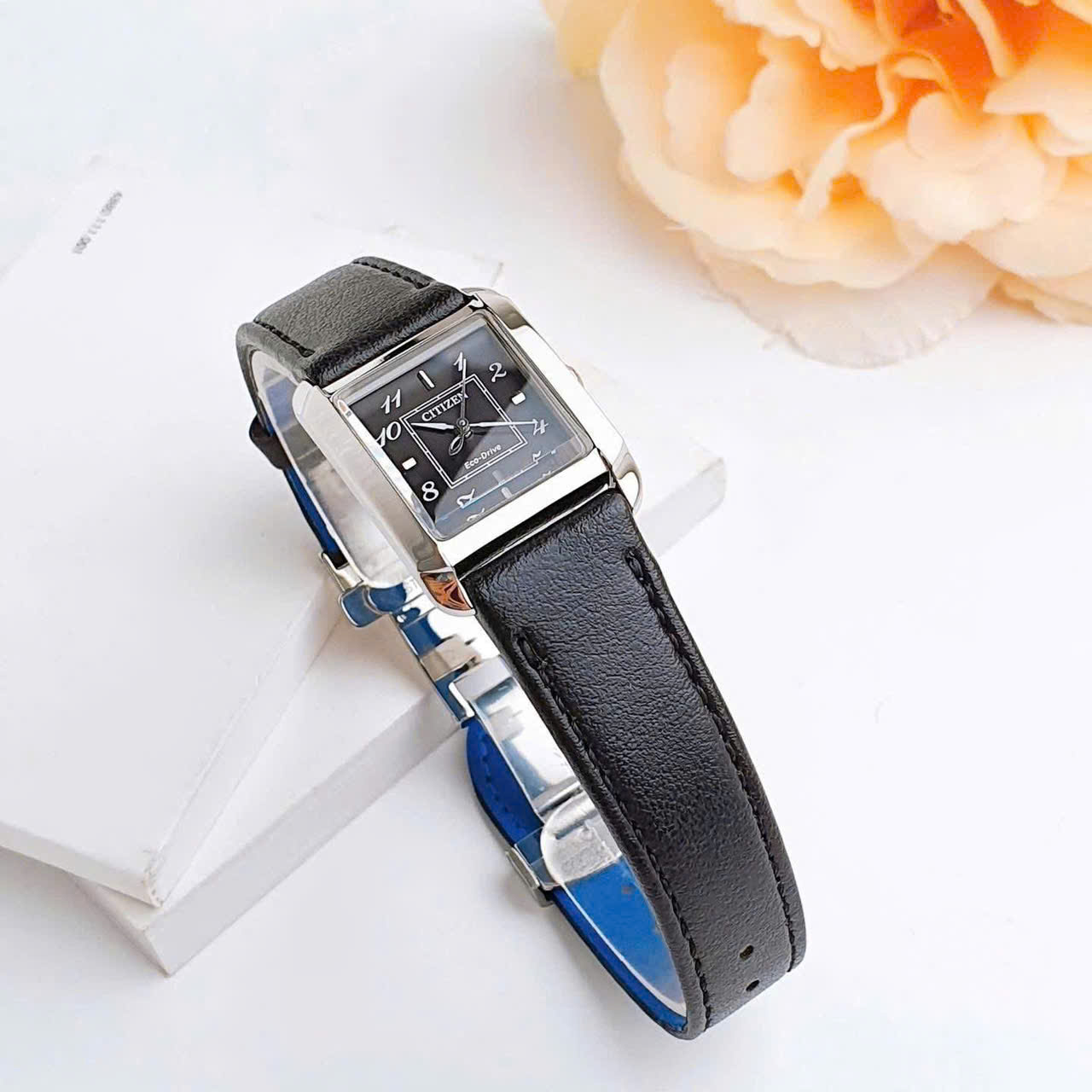Citizen Eco-Drive với thiết kế mặt hình chữ nhật cổ điển mang đến vẻ đẹp tối giản nhưng rất sang trọng . Vỏ thép không gỉ kết hợp mặt số đen cọc số và kim chỉ thanh mảnh tạo nên phong thái lịch lãm và sang trọng. Dây da đen cao cấp ôm cổ tay gọn gàng phù hợp cho trang phục công sở và cả những dịp đặc biệt. Công nghệ Eco-Drive hấp thụ ánh sáng để duy trì hoạt động không cần thay pin biểu tượng của sự bền bỉ và giá trị lâu dài. Đây là chiếc đồng hồ không chỉ để xem giờ mà còn là món trang sức cao cấp thể hiện giá trị và gu thẩm mỹ thời thượng của quý cô.