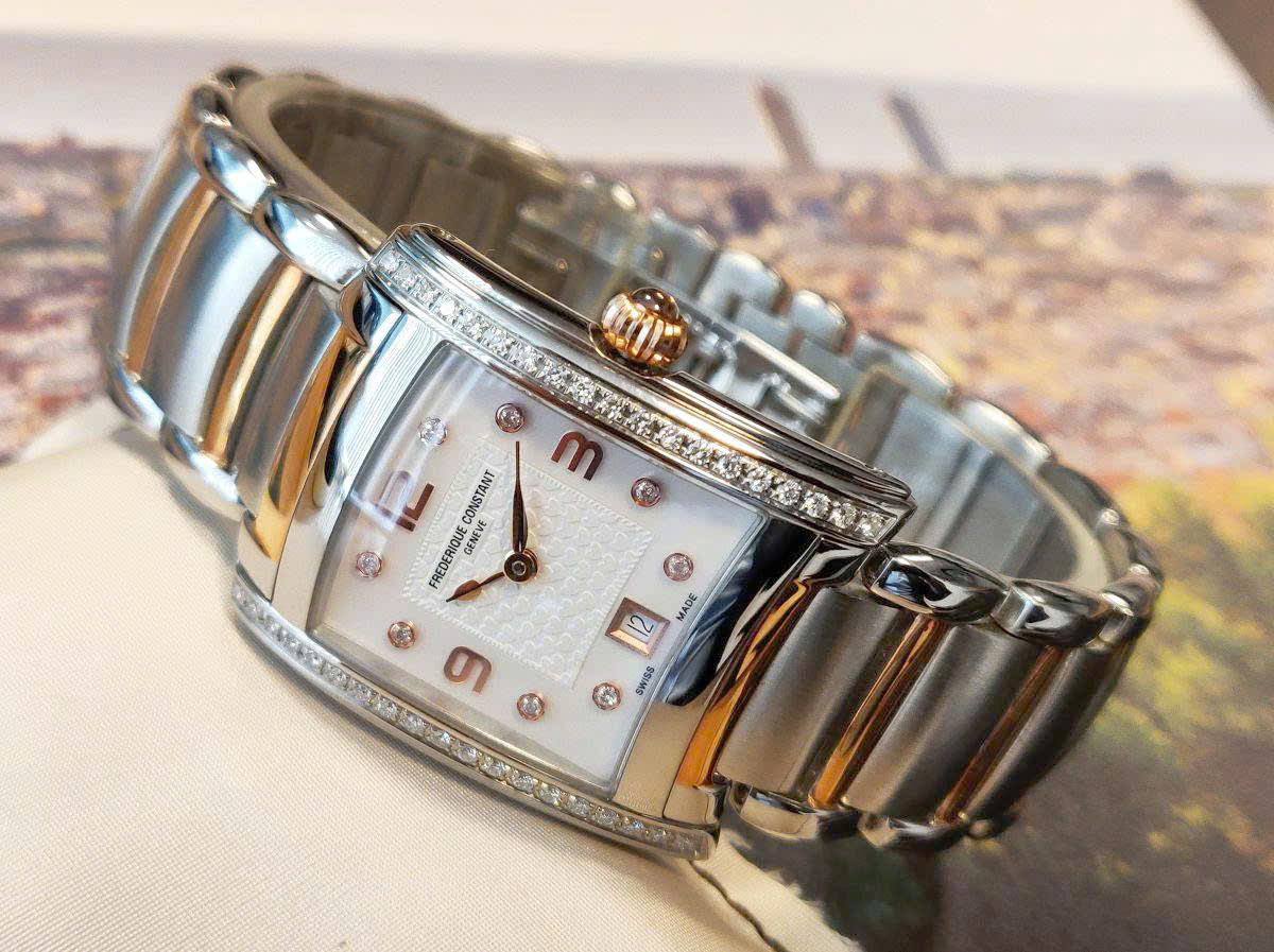 Chiếc Frederique Constant này là tuyệt phẩm dành cho phái đẹp mang đậm phong cách quý phái và sang trọng. Thiết kế mặt số chữ nhật độc đáo cùng viền đính kim cương tinh xảo kết hợp nền khảm trai lấp lánh với cọc số đính đá cao cấp. Bộ kim và số được mạ vàng hồng nổi bật tạo nên sự hài hòa và tinh tế. Vỏ và dây thép không gỉ phối màu bạc – vàng hồng thời thượng vừa bền chắc vừa tôn lên vẻ đẹp đẳng cấp. Thiết kế hoàn hảo cho những quý cô hiện đại khẳng định phong thái thanh lịch và sang trọng trong mọi khoảnh khắc.