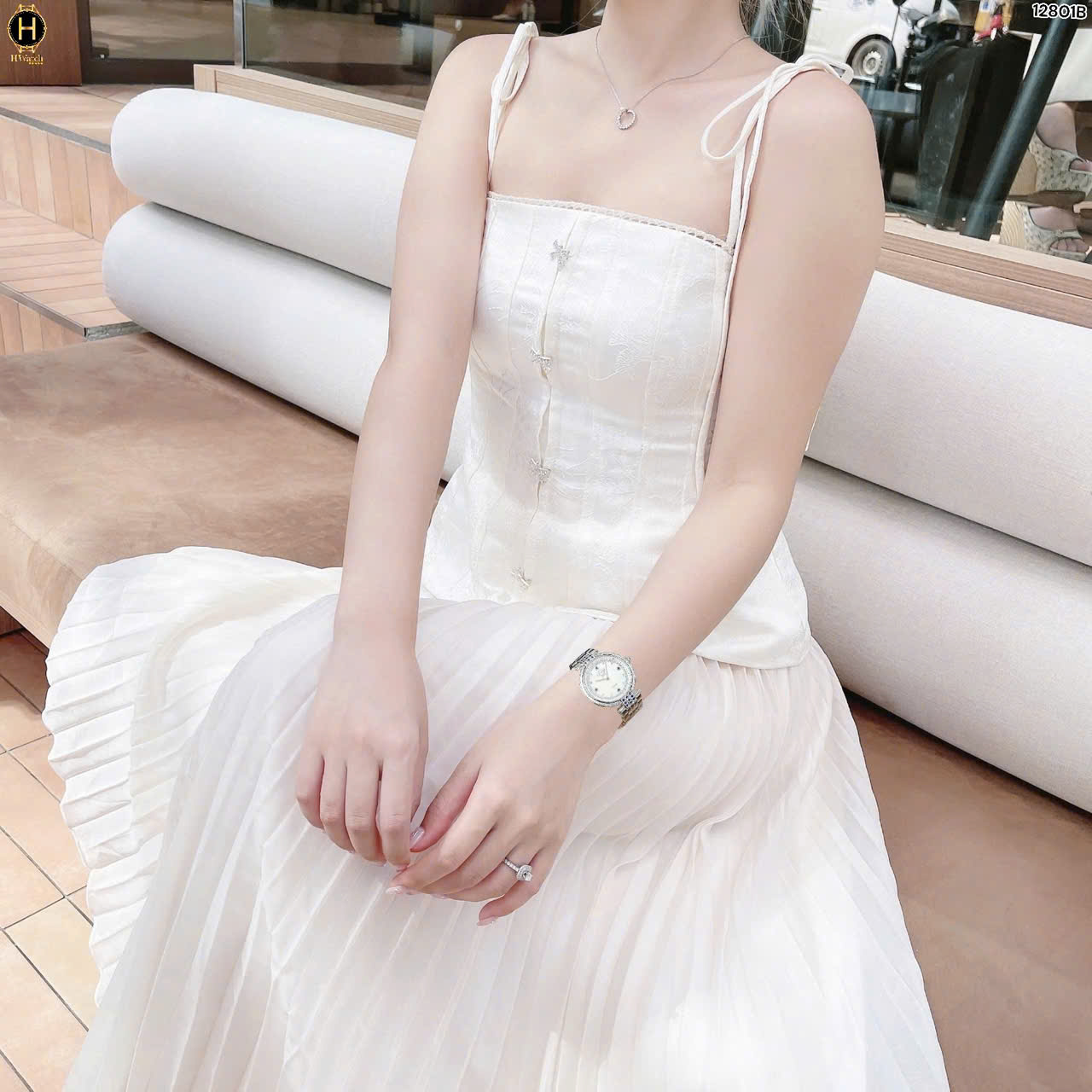 Thiết kế dây thép không gỉ, dây gắn kết với vỏ bởi đoạn nối phủ đá quý xanh tinh tế cùng mặt số màu trắng khảm trai tuyệt đẹp nổi bật với sự lấp lánh, kiêu sa của những viên kim cương & đá quý tạo nên thiết kế hoàn hảo, tinh xảo & xa hao dành cho phái đẹp.