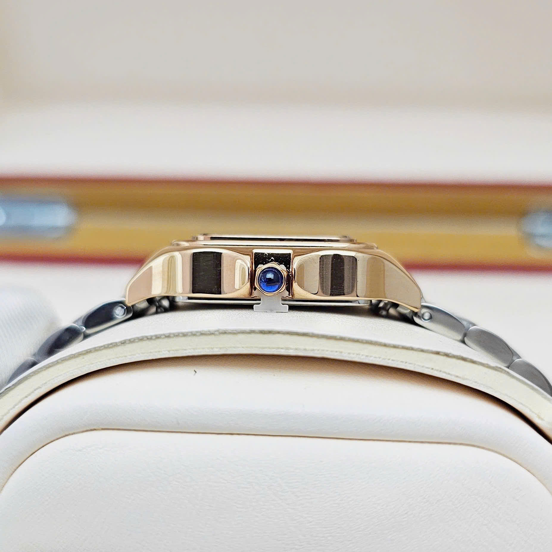 Thiết kế dây & vỏ thép không gỉ mạ vàng hồng sang trọng cùng mặt số tròn truyền thống màu xanh dương thời trang cùng kim chỉ tông vàng hồng thanh mảnh phủ nổi bật là cọc số La mã cổ điển đan xen với những viên Diamond lấp lánh, kiêu sa tạo nên tổng thể hoàn hảo, bắt mắt & thu hút mọi ánh nhìn của phái đẹp.