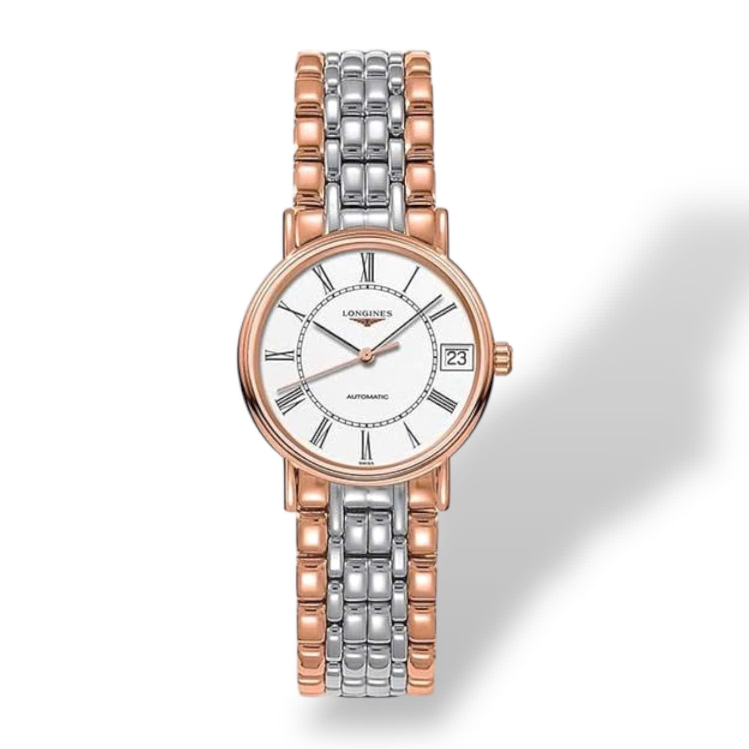 Chiếc đồng hồ Longines này sở hữu vẻ đẹp thanh lịch và sang trọng với thiết kế dây đeo demi phối hợp tinh tế giữa thép không gỉ màu bạc và các mắt demi mạ vàng hồng sang trọng. Vỏ tròn nhỏ gọn bằng thép không gỉ mạ vàng hồng bao bọc mặt số trắng trang nhã nổi bật với các cọc số La Mã cổ điển và bộ kim thanh mảnh đầy tinh tế. Cửa sổ lịch ngày đặt gọn gàng tại vị trí 3 giờ giúp tăng tính tiện dụng. Sự kết hợp hài hòa giữa chất liệu cao cấp phong cách cổ điển và bộ máy Automatic bền bỉ khiến đây trở thành lựa chọn hoàn hảo cho các quý cô.