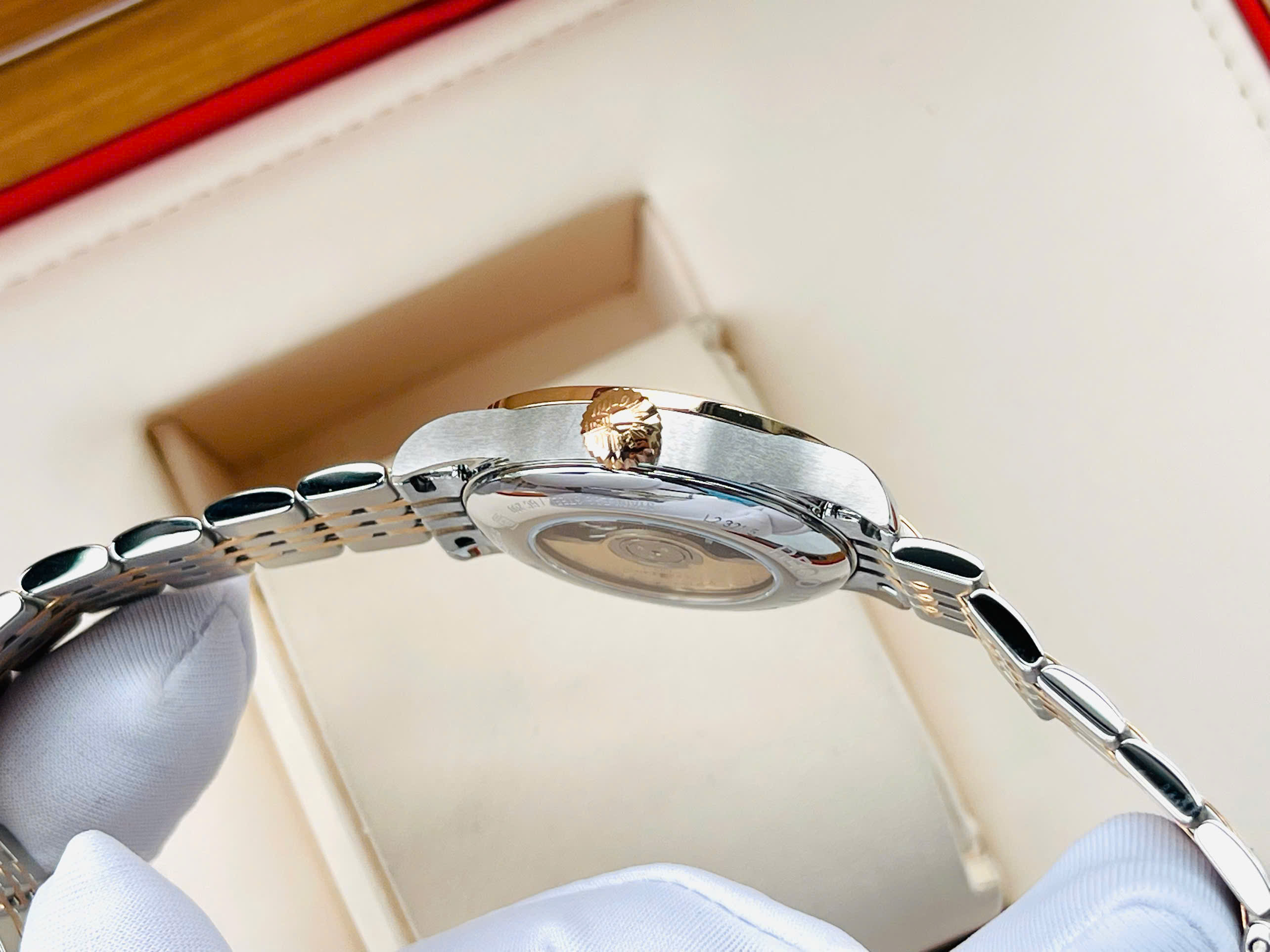 Thiết kế với dây demi & vỏ thép không gỉ & vàng 18K đắt đỏ, mặt số tròn truyền thống màu bạc nhã nhặn với kim chỉ mạ vàng hồng sang trọng cùng ô lịch ngày tiện ích ở góc 3h nổi bật là cọc số học trò bản to dễ dàng cho người đeo quan sát tạo nên phiên bản sang trọng đẳng cấp dành cho các quý cô sành điệu.
