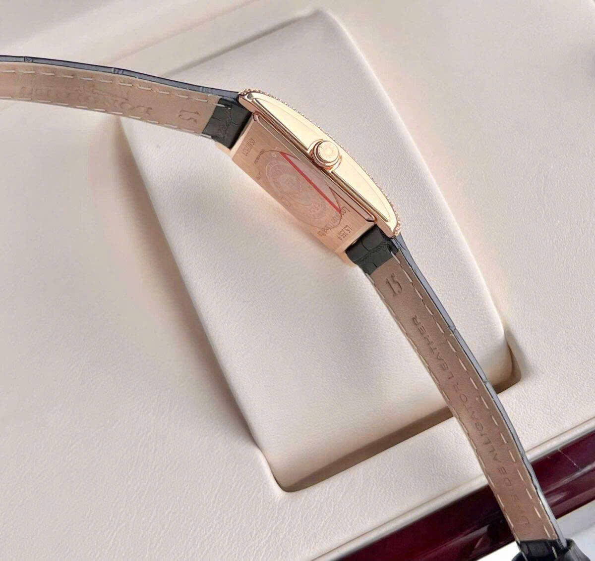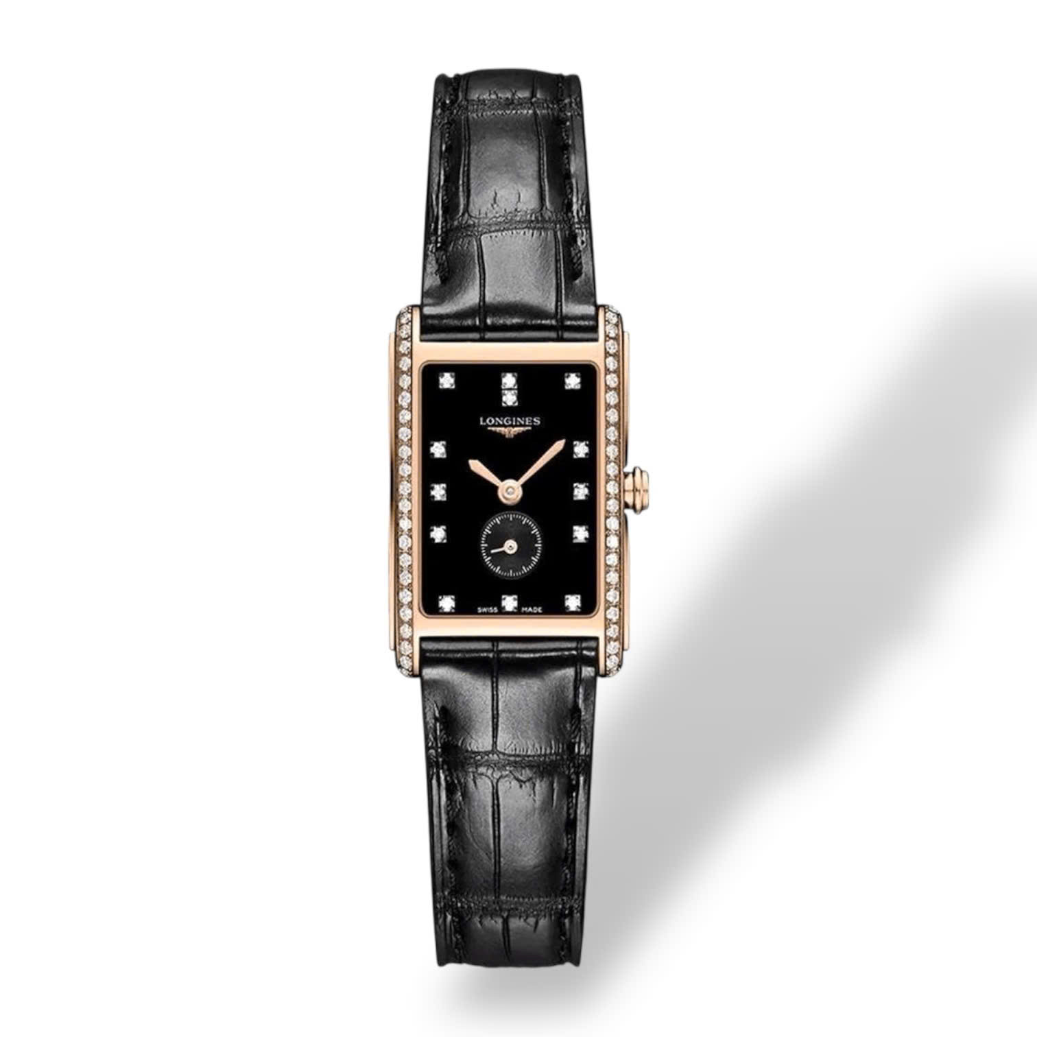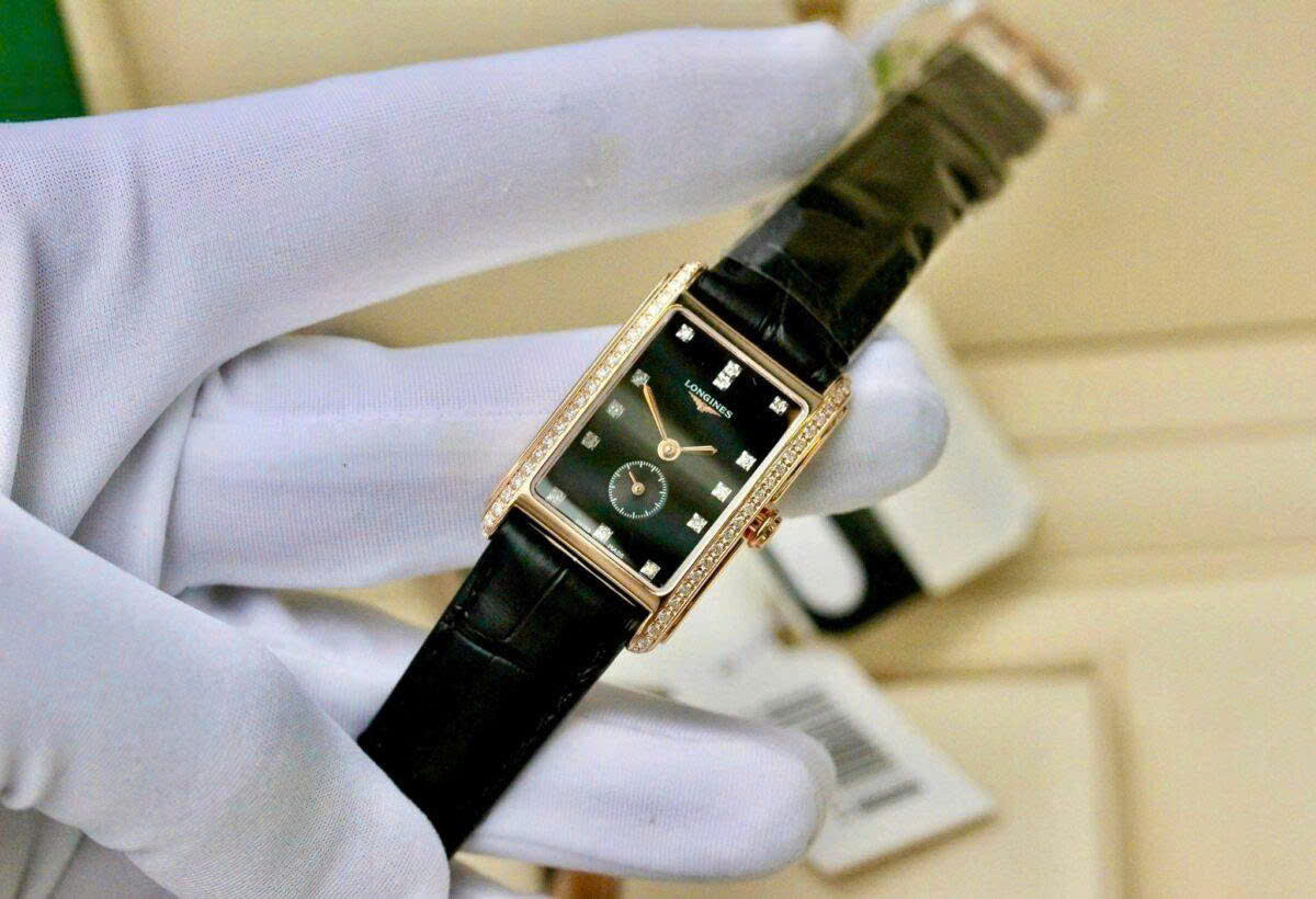 Chiếc Longines này là minh chứng hoàn hảo của Thụy Sĩ với vẻ đẹp thanh lịch hòa quyện cùng sự sang trọng tinh tế. Thiết kế mặt số chữ nhật đen đầy cuốn hút nổi bật với các cọc số đính kim cương rực rỡ mang lại ánh sáng lấp lánh ở mọi góc nhìn. Viền vỏ vàng hồng được đính đá quý tinh xảo tôn thêm vẻ quý phái và đẳng cấp. Ở vị trí 6h mặt số phụ nhỏ nhắn hiển thị giây được đặt khéo léo cân bằng hoàn hảo tổng thể thiết kế. Dây da có các vân cao cấp mềm mại ôm trọn cổ tay đem đến cảm giác vừa sang trọng vừa thoải mái. Đây không chỉ là một chiếc đồng hồ mà còn là món trang sức tinh tế dành cho những quý cô yêu phong cách thanh lịch và muốn khẳng định dấu ấn riêng.