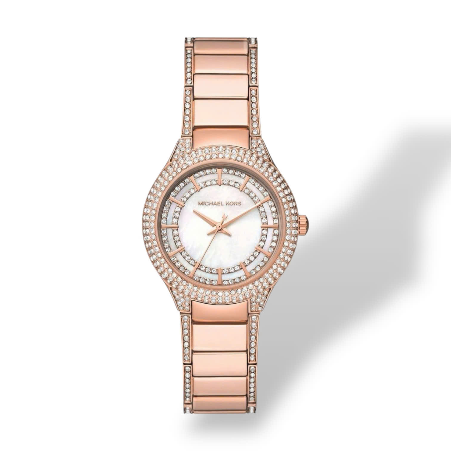 Michael Kors Parker Rose Gold tỏa sáng rực rỡ với thiết kế đính đá full ôm trọn viền bezel và dây đeo kim loại mạ vàng hồng thời thượng. Mặt số khảm trai tạo nên hiệu ứng phản chiếu mềm mại tôn lên vẻ đẹp nữ tính đầy cuốn hút. Các chi tiết tinh xảo cùng tông màu vàng hồng mang lại cảm giác quý phái. Đây không chỉ là phụ kiện để xem giờ mà còn là món trang sức xa hoa khẳng định phong cách và đẳng cấp riêng của người phụ nữ hiện đại.