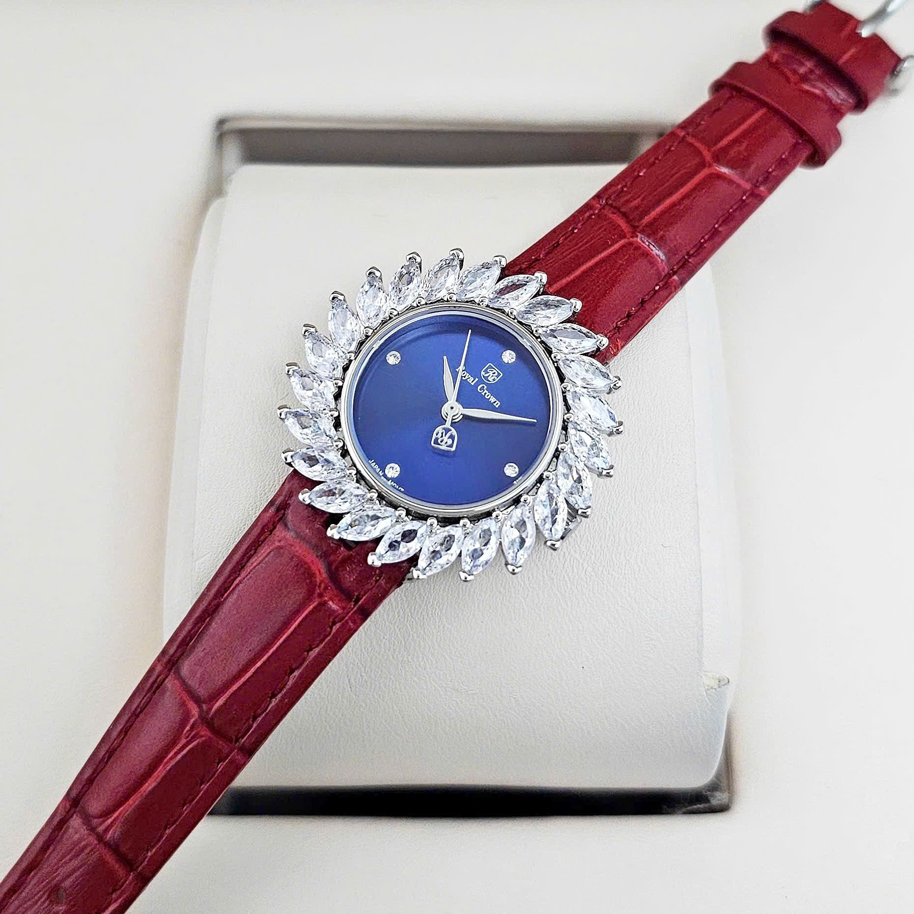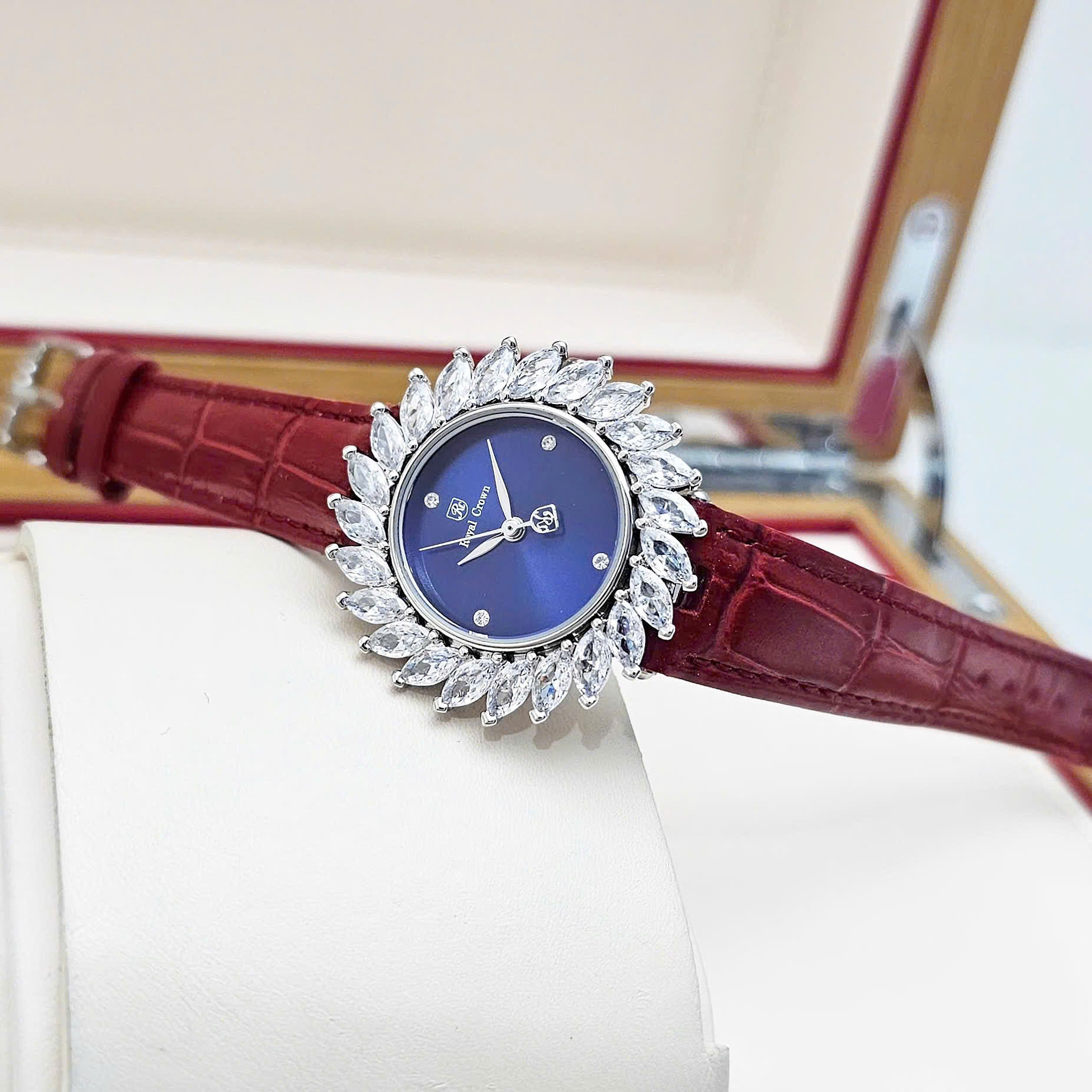 Đồng Hồ Nữ Royal Pin 4652 Dây Da Vỏ Trắng Mặt Xanh Viền Đá