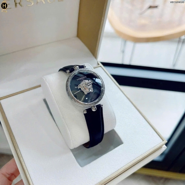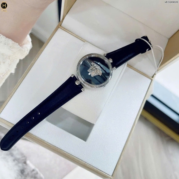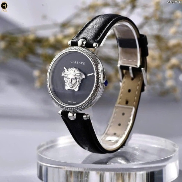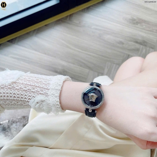 Thiết kế dây da cao cấp, vỏ thép không gỉ họa tiết chìa khóa nối tiếp nhau độc đáo tinh tế cùng mặt số màu đen chải tia đẹp mắt cùng logo Medusa đặc trưng, ấn tượng của thương hiệu.