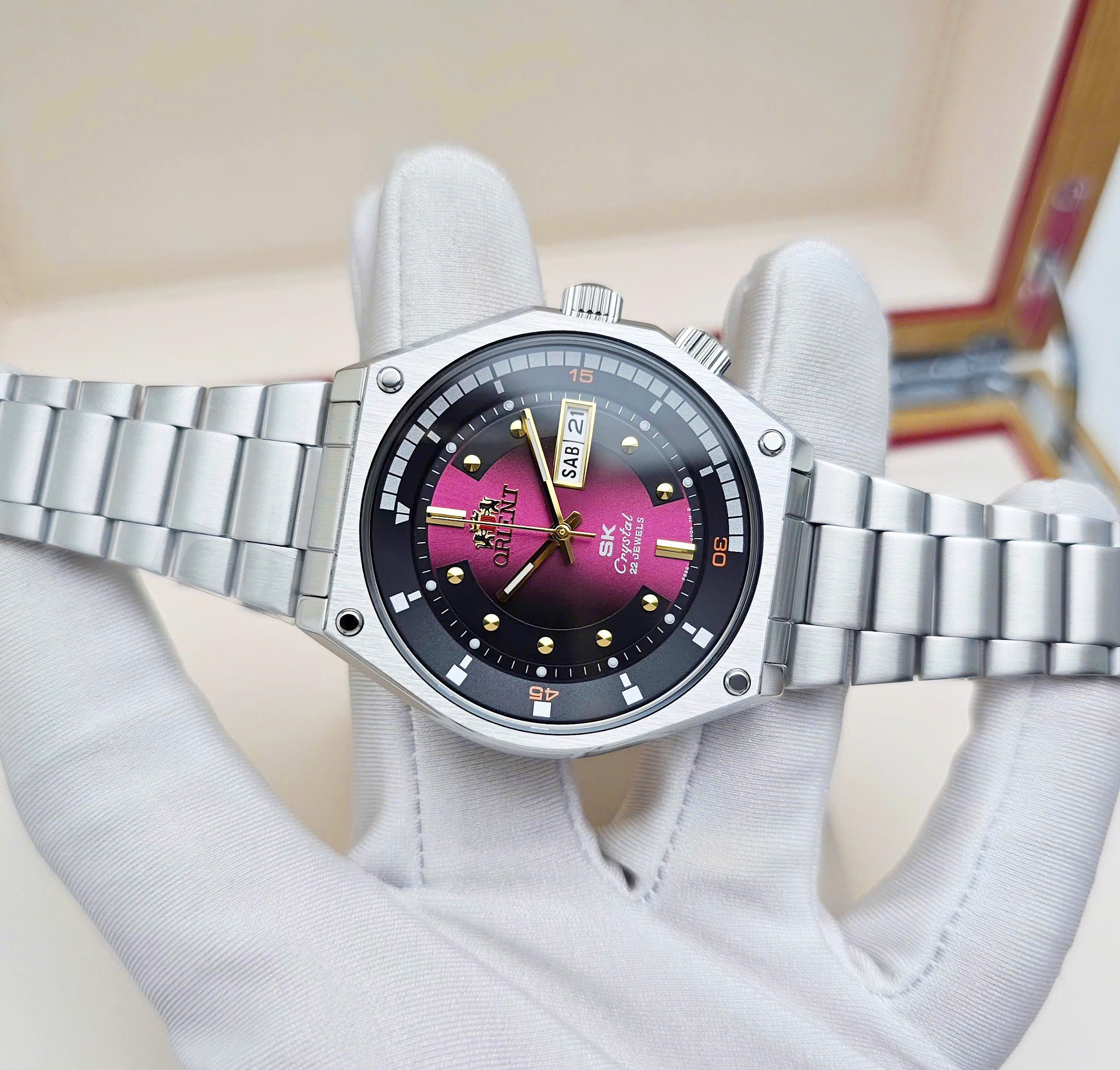 Khi lên tay thực tế, Orient SK Red mang lại cảm giác đầm chắc, cân đối và đậm chất nam tính. Trọng lượng vừa phải giúp đồng hồ ôm tay tự nhiên, tạo sự chắc chắn nhưng không gây nặng nề khi đeo lâu. Mặt số đỏ chuyển sắc tinh tế trở thành điểm nhấn nổi bật, đủ thu hút ánh nhìn mà vẫn giữ được sự hài hòa, không phô trương. Đây là kiểu đồng hồ càng đeo càng quen, càng sử dụng càng cảm nhận rõ sự ổn định và dễ chịu – đúng tinh thần của đồng hồ cơ Nhật Bản: bền bỉ và gắn bó lâu dài với người đeo.