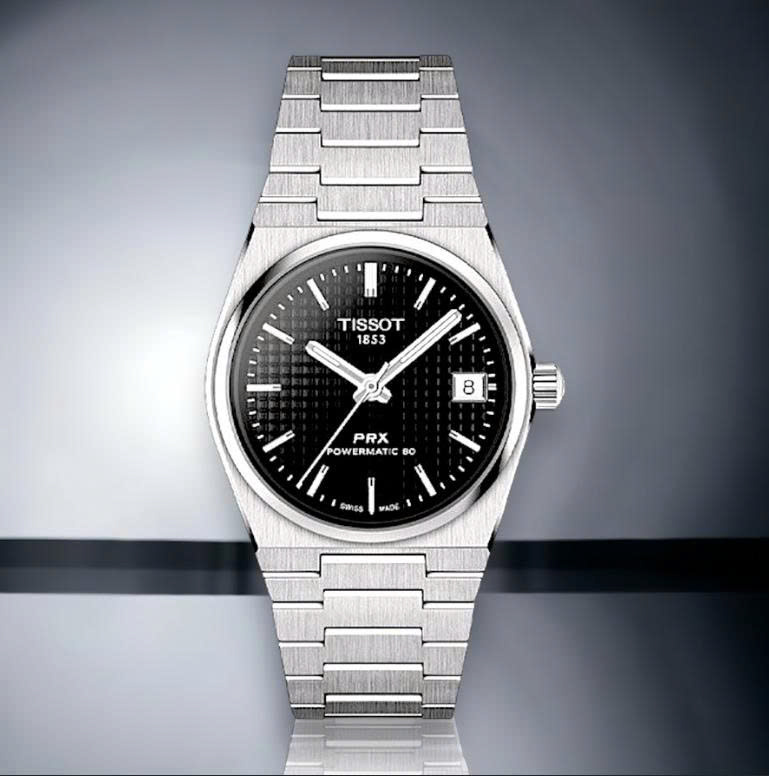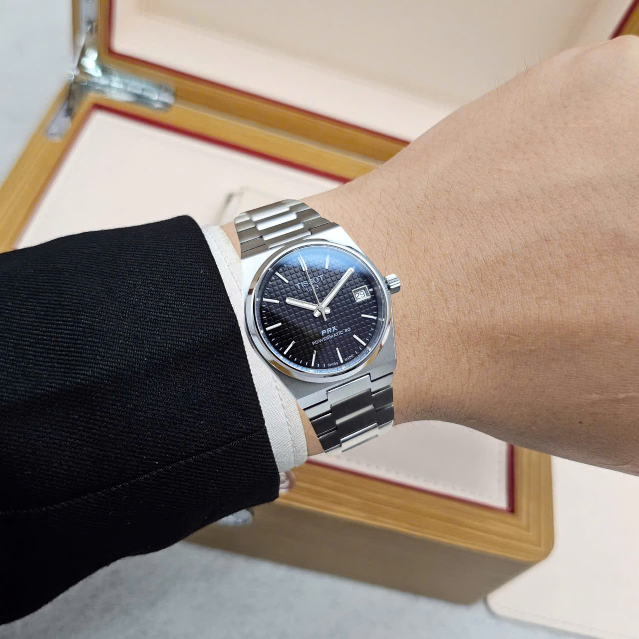 - Phiên bản PRX Powermatic 80 35mm mặt đen sở hữu mặt số vân đặc trưng – chi tiết làm nên danh tiếng của dòng PRX Automatic.